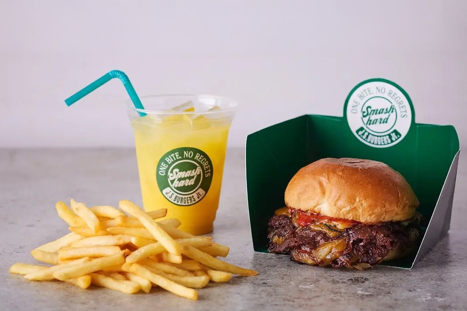 「J.S. BURGERS Jr.」は、グルメバーガーをより身近に楽しめる新スタイルのバーガーショップ。赤身主体の牛肉100%パティを鉄板で高圧プレスし、肉汁をギュッと閉じ込める「スマッシュバーガー」が看板メニューです。