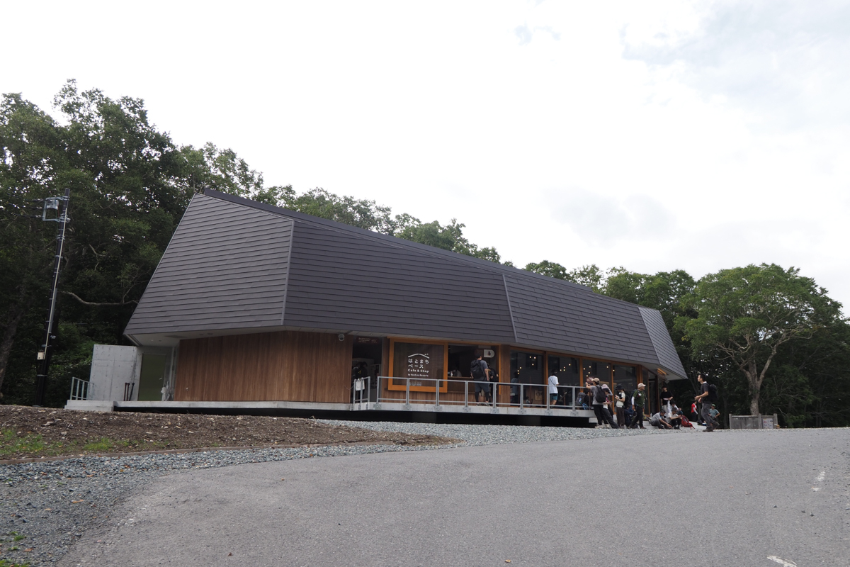 山小屋風の外観のホテルの手前には、のんびり読書をしたりゲームをしたり、ソフトクリームを食べたりできるテラス席があります。