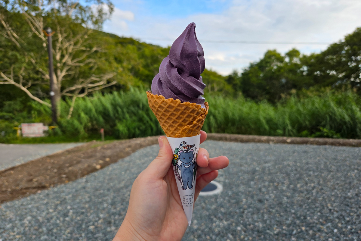 尾瀬名物・花豆ソフトクリームも販売されていたので、ホテルの外のベンチでおやつにいただきました。