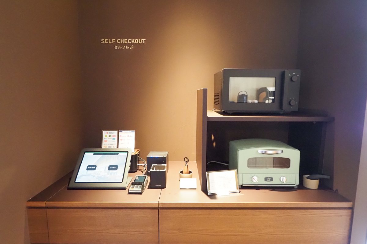 購入はセルフレジで。現金は使えませんが、クレジットカードや各種電子マネーに幅広く対応しています。レンジやトースターもあるので朝ごはんの温め等に便利です。