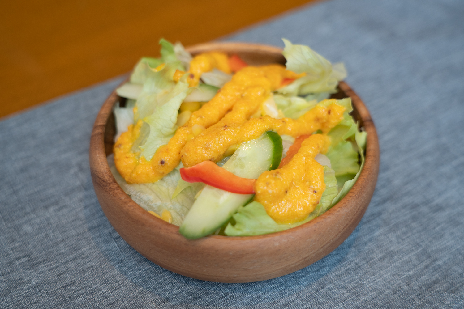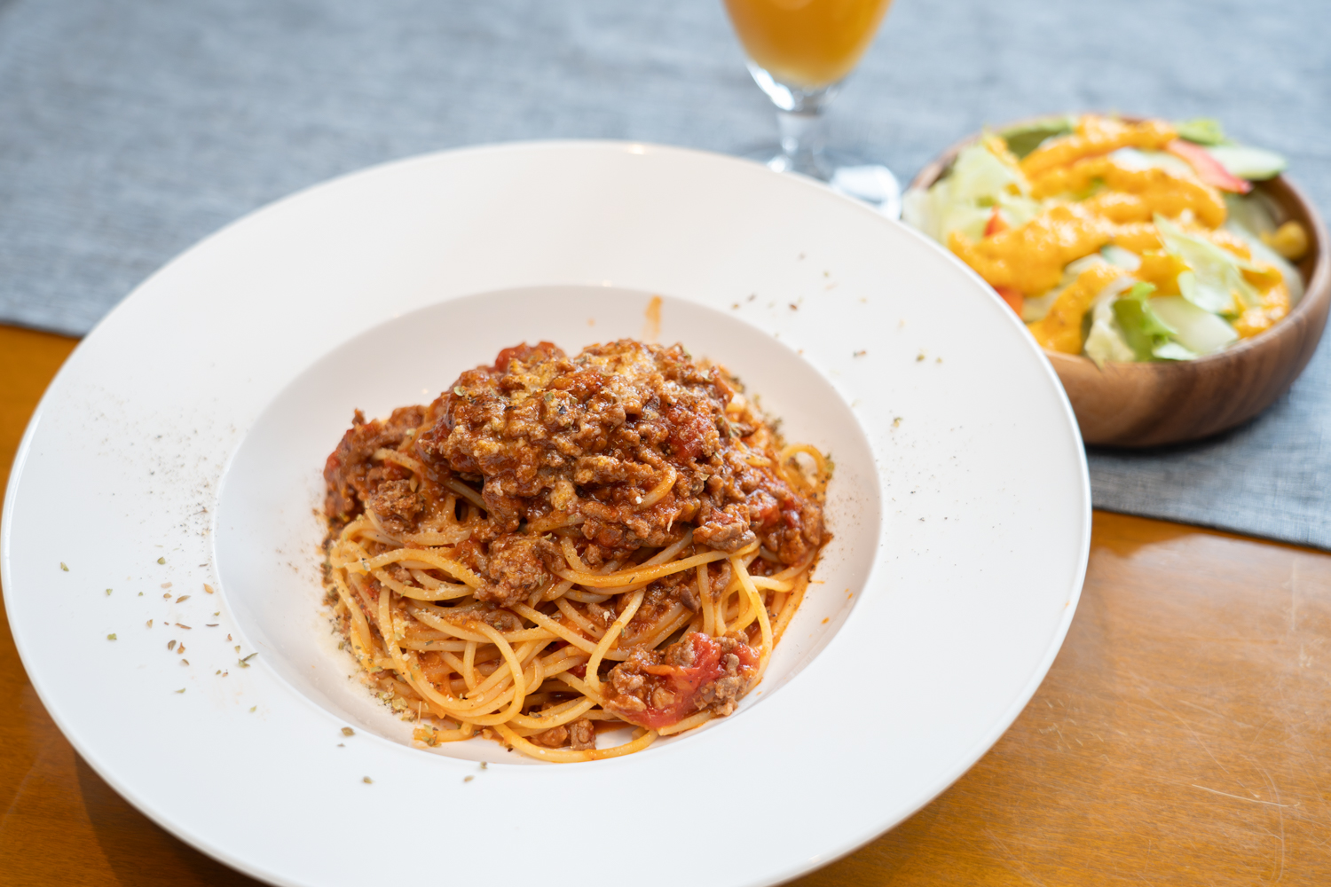 セットのサラダには、自家製のキャロットドレッシングがかかっています。にんじんのやさしい甘さと野菜の風味が、濃厚なボロネーゼとの相性ぴったり。ランチタイムのひとときを、ちょっと贅沢にしてくれる一皿です。
