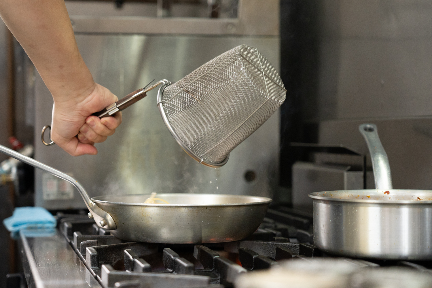茹で上がったパスタを湯切りし、熱気とともにソースの待つフライパンへ。