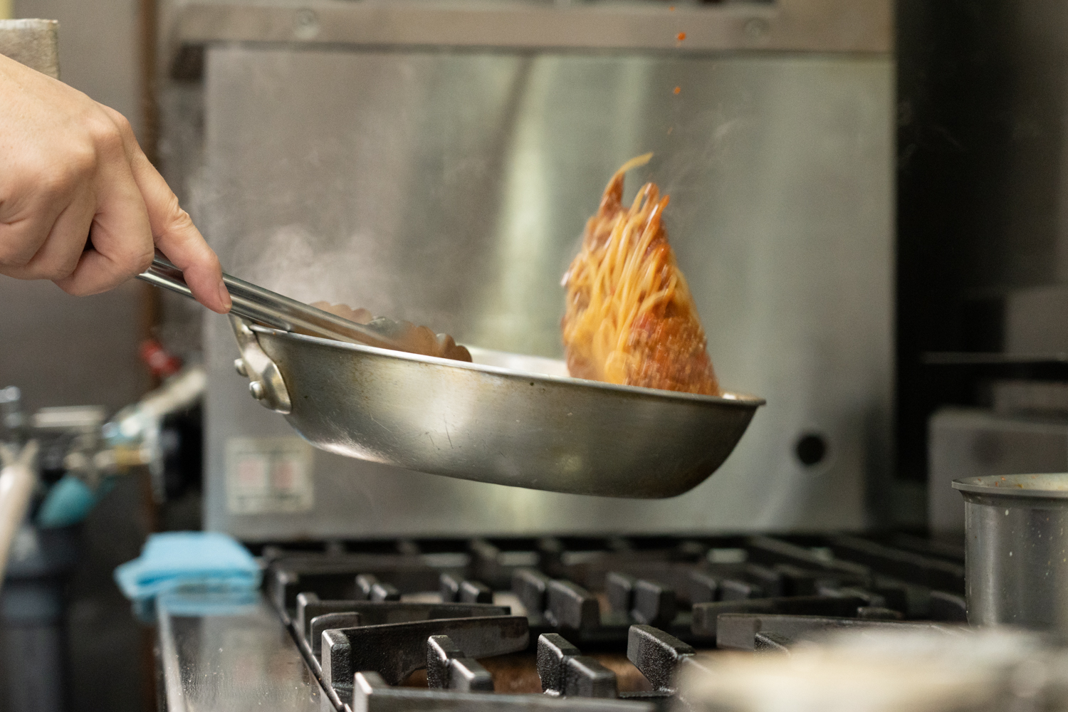 熱々のフライパンの上で宙を描きながら踊るパスタがソースと絡み合い、「ジュワッ」と音を立てて食欲をそそります。