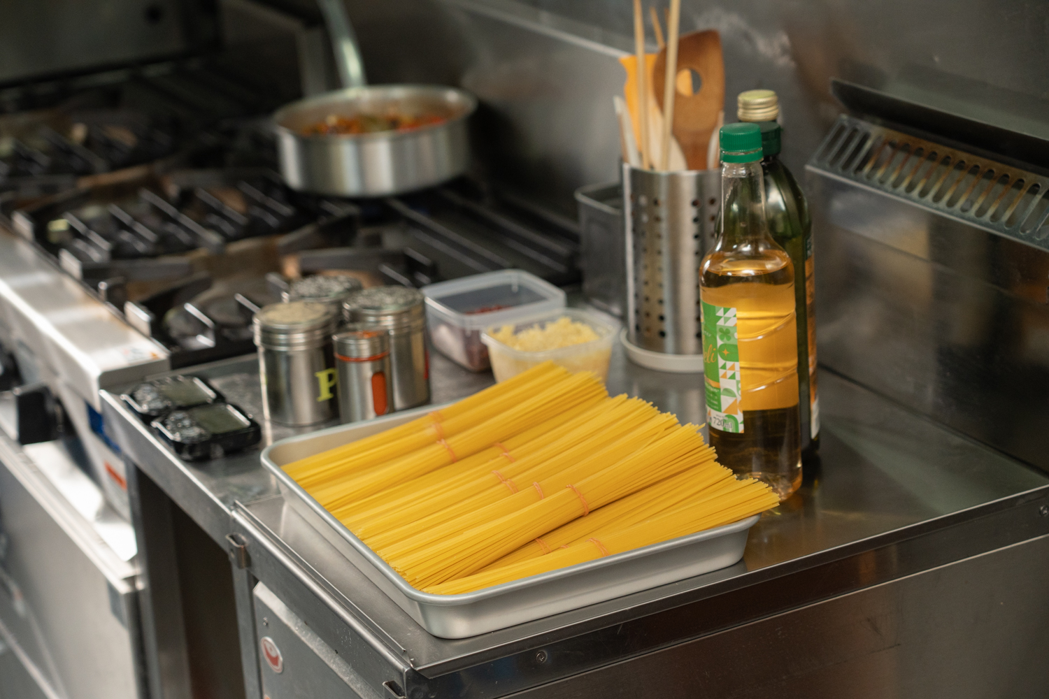 厨房の奥では、黄金色のパスタが整然と並び、出番を待っています。