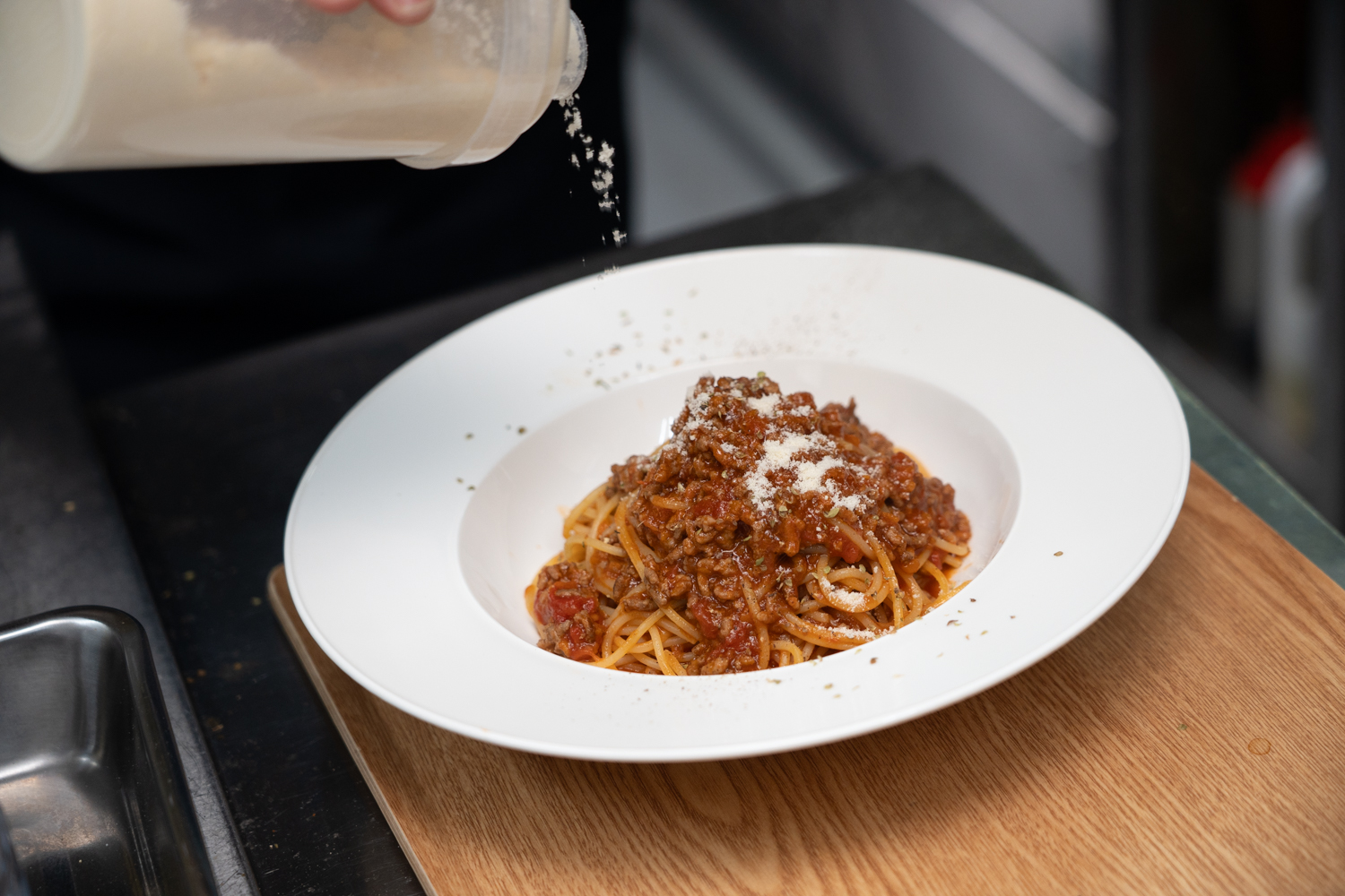仕上げにチーズをひと振り。これで、色鮮やかなボロネーゼが完成です。
