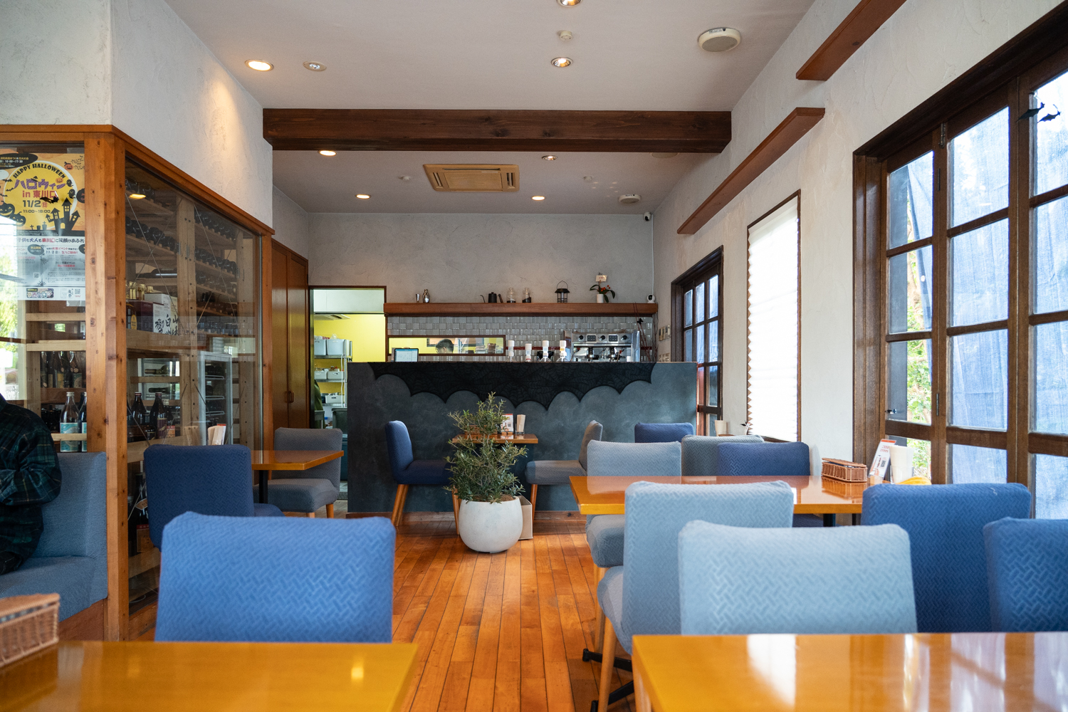 テーブルや床の木目がほどよく温かく、ブルーのチェアがアクセントになった落ち着いた雰囲気。カジュアルでありながら、どこか上品さを感じる空間です。