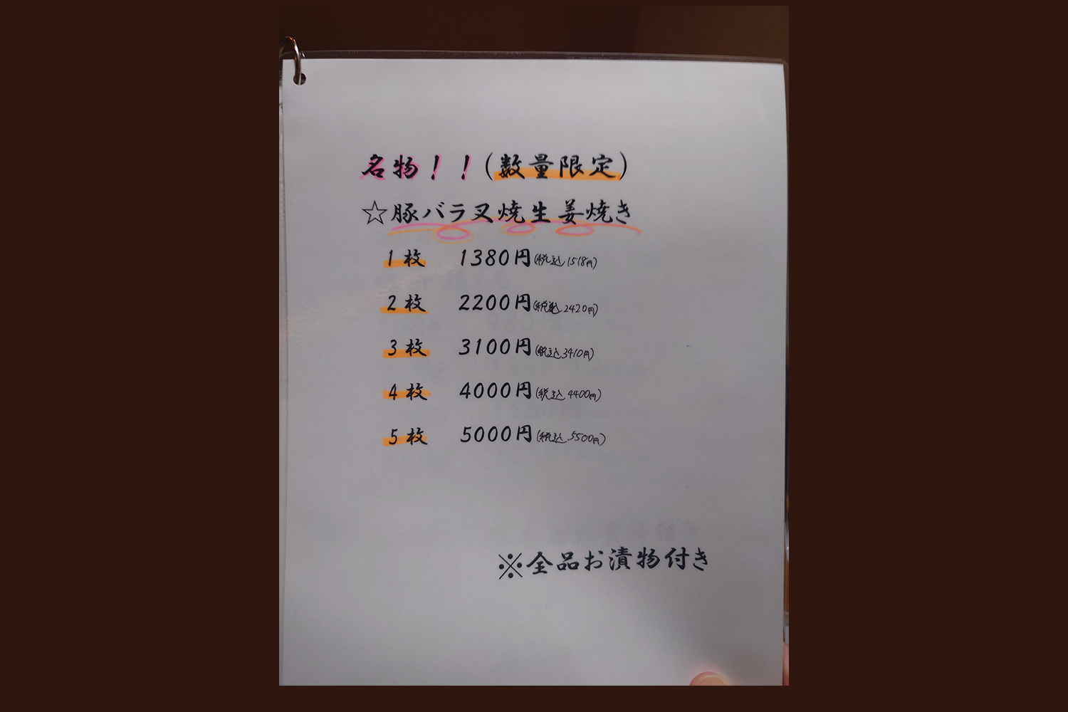 注文したのはもちろん看板メニューの「大判叉焼の生姜焼き定食」。1枚から5枚まで選べますが、この日は1枚を選びました。