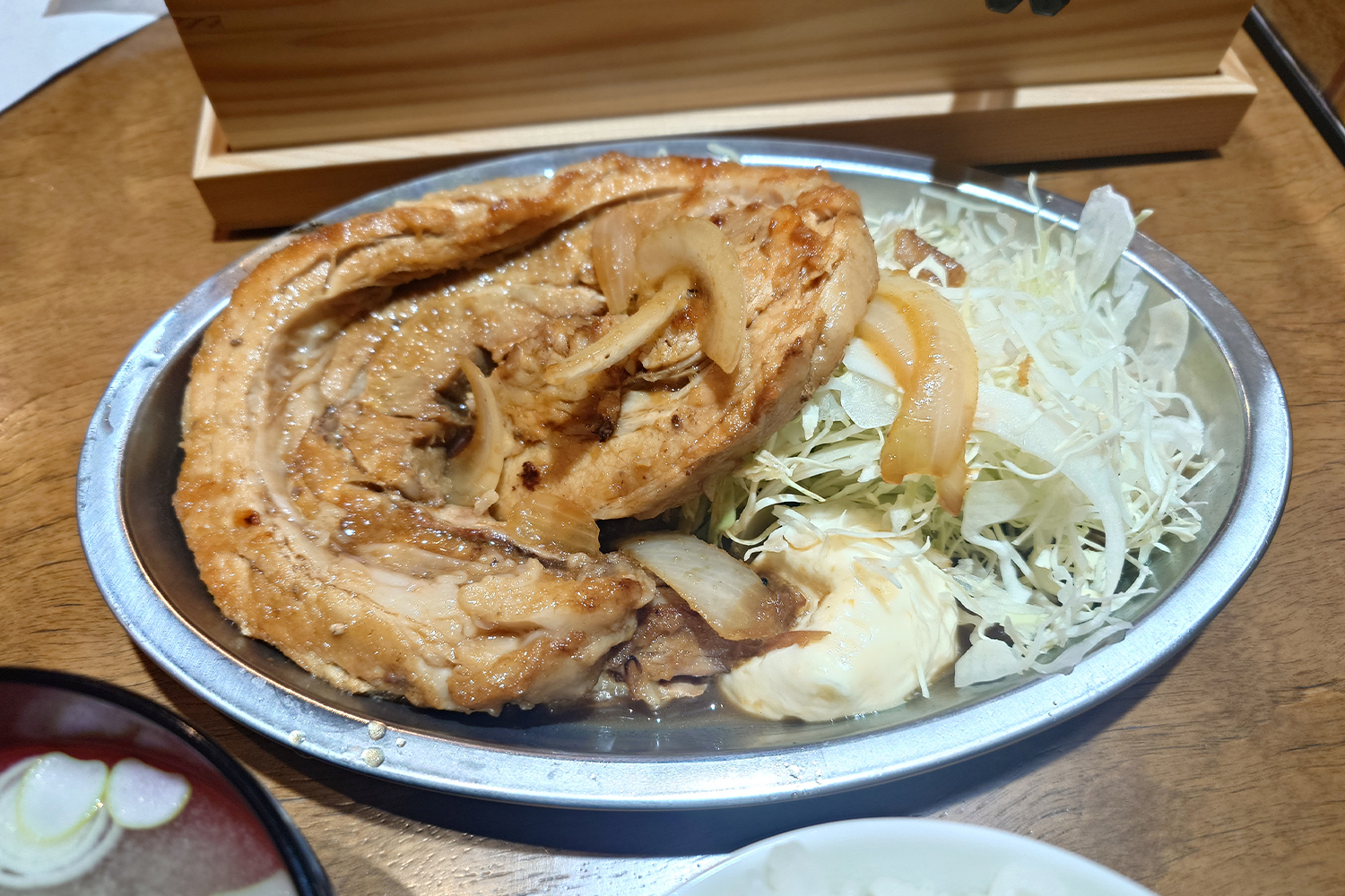 お皿の半分を覆い尽くすほどの、ぐるっと渦巻く極厚叉焼は、上からは甘辛い香味ダレ、そして炒めた玉ねぎがとろんと絡み、キャベツの千切り、水気を含んだマヨとのコントラストがたまりません。