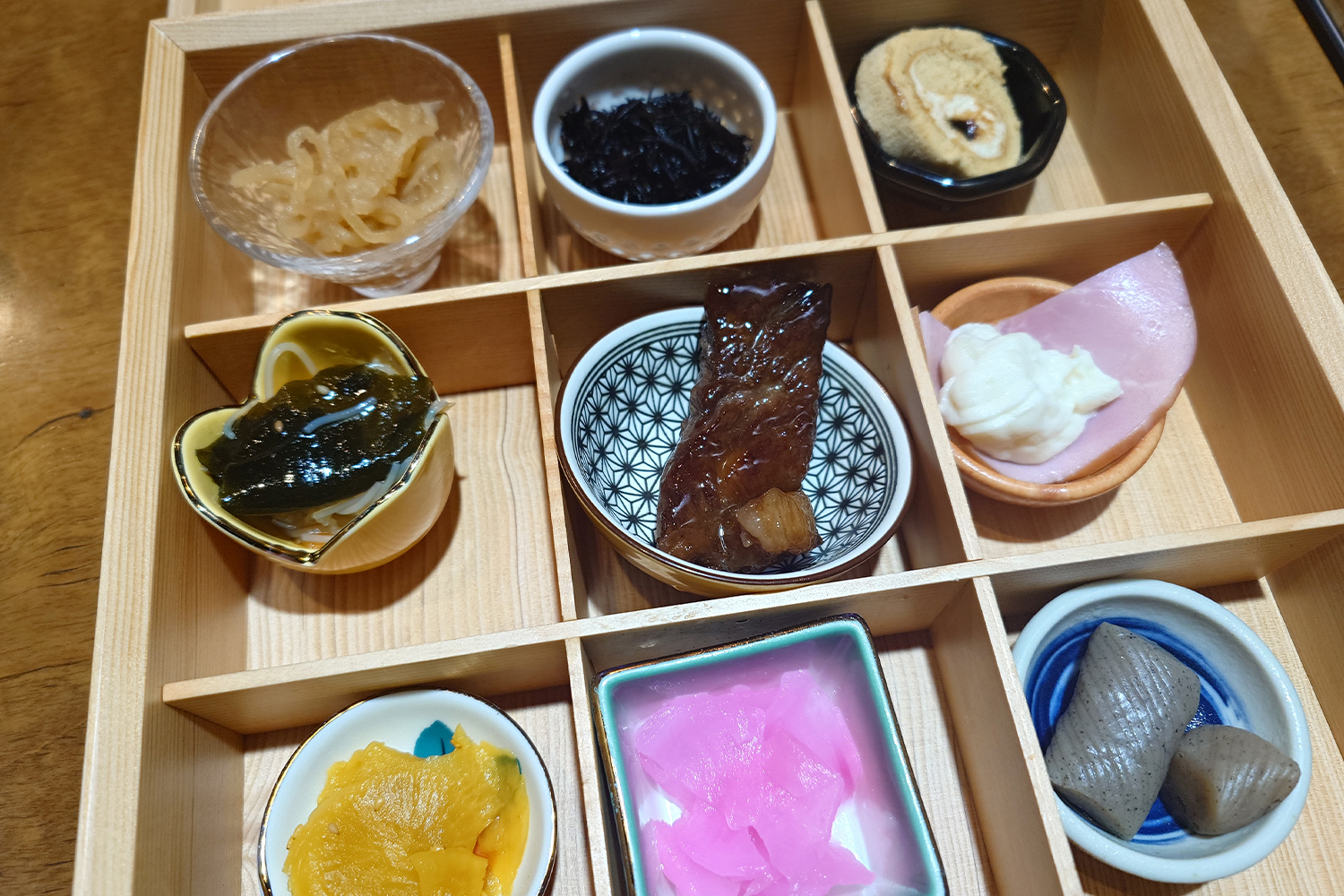 木箱に仕切られた小鉢がズラッと並び、まるで旅館の朝食のような贅沢さ。この日は、昆布、切り干し大根、茄子、ピリ辛系、さっぱり系、お口直しの甘味まで。生姜焼きの濃厚な味わいをリセットしてくれる名脇役たちです。