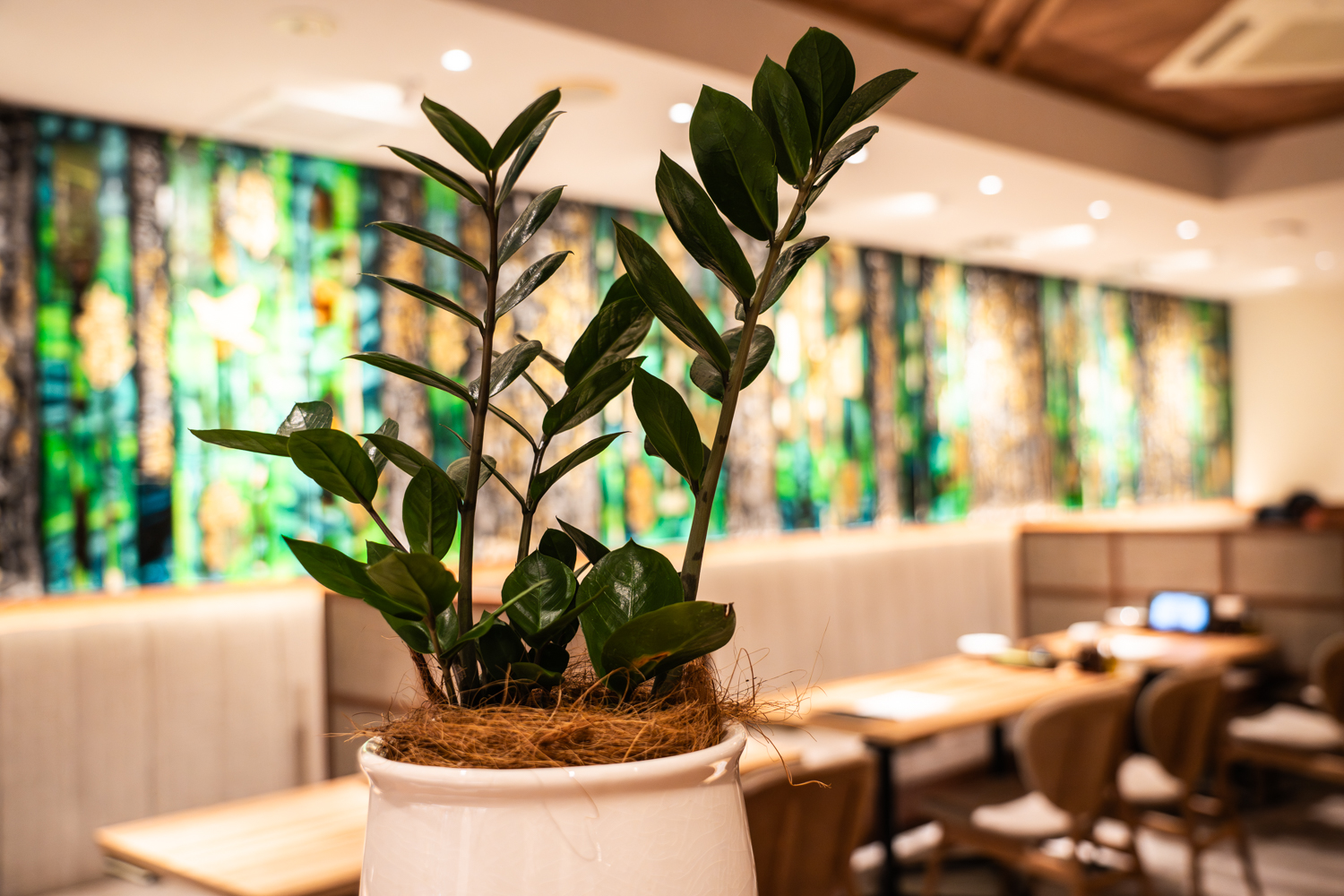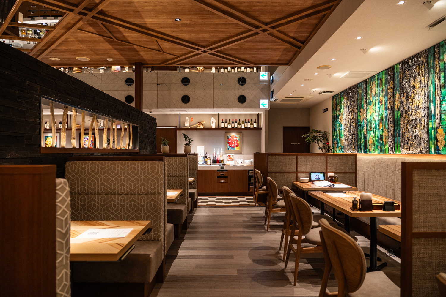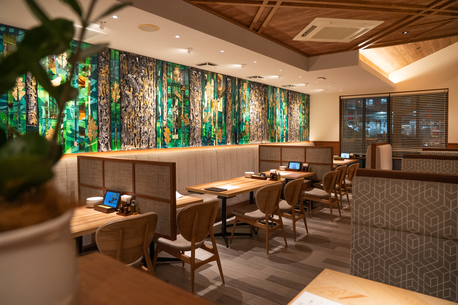 店内は、温かみのある木目調の天井やテーブルと、随所に配置されたグリーンが調和したモダンなデザインです。グリーンやゴールドの色彩が奥ゆきを感じさせる立体的なアートが印象的で、天井の格子状のデザインと相まって、静謐な森の中にいるような深いリラックス感を与えてくれます。