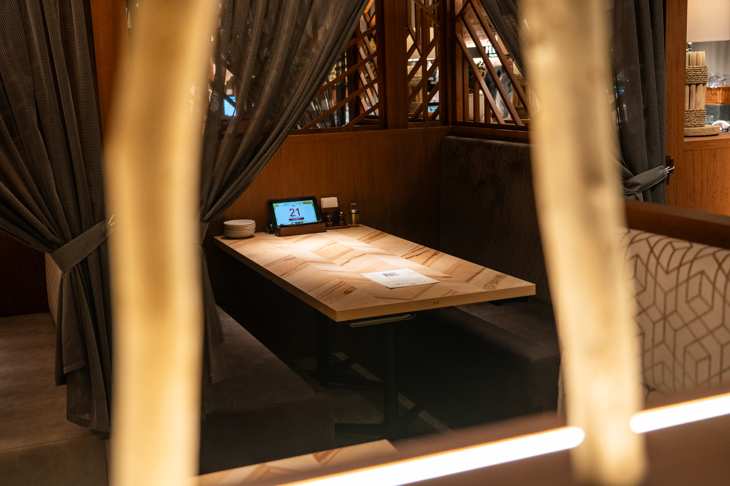カーテンで仕切れるボックス席は、まるで隠れ家のようなプライベート感。デートや親密な友人との語らいに最適です。