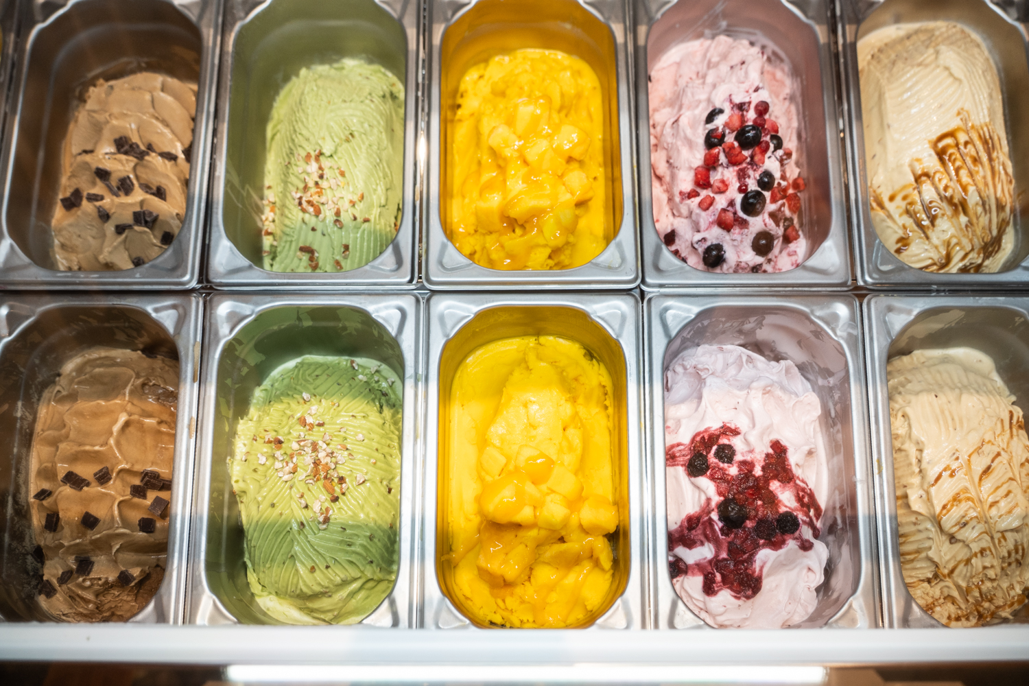 数種類あるジェラートは、1品につき2つのフレーバーを選ぶことができます。他のスイーツとは異なり、一度に2つの味を楽しめるので、なんだか少し得した気分になります。