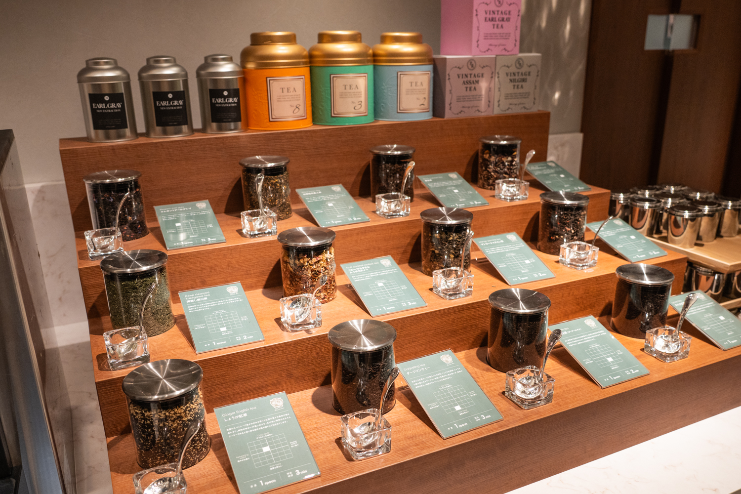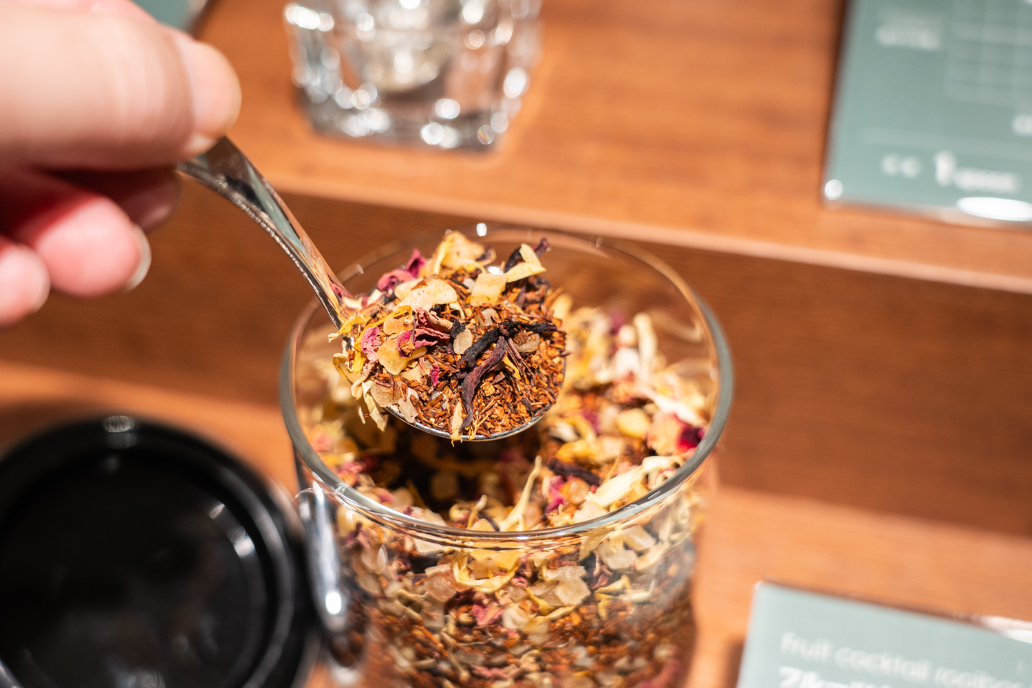 ずらりと並んだガラス瓶の中には、フルーツやハーブがたっぷりとブレンドされたフレッシュな茶葉が入っています。