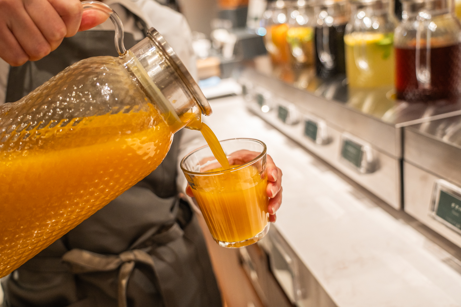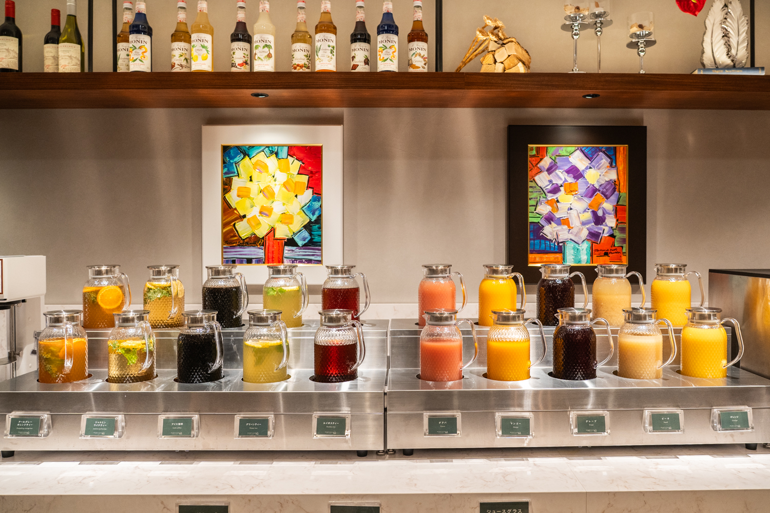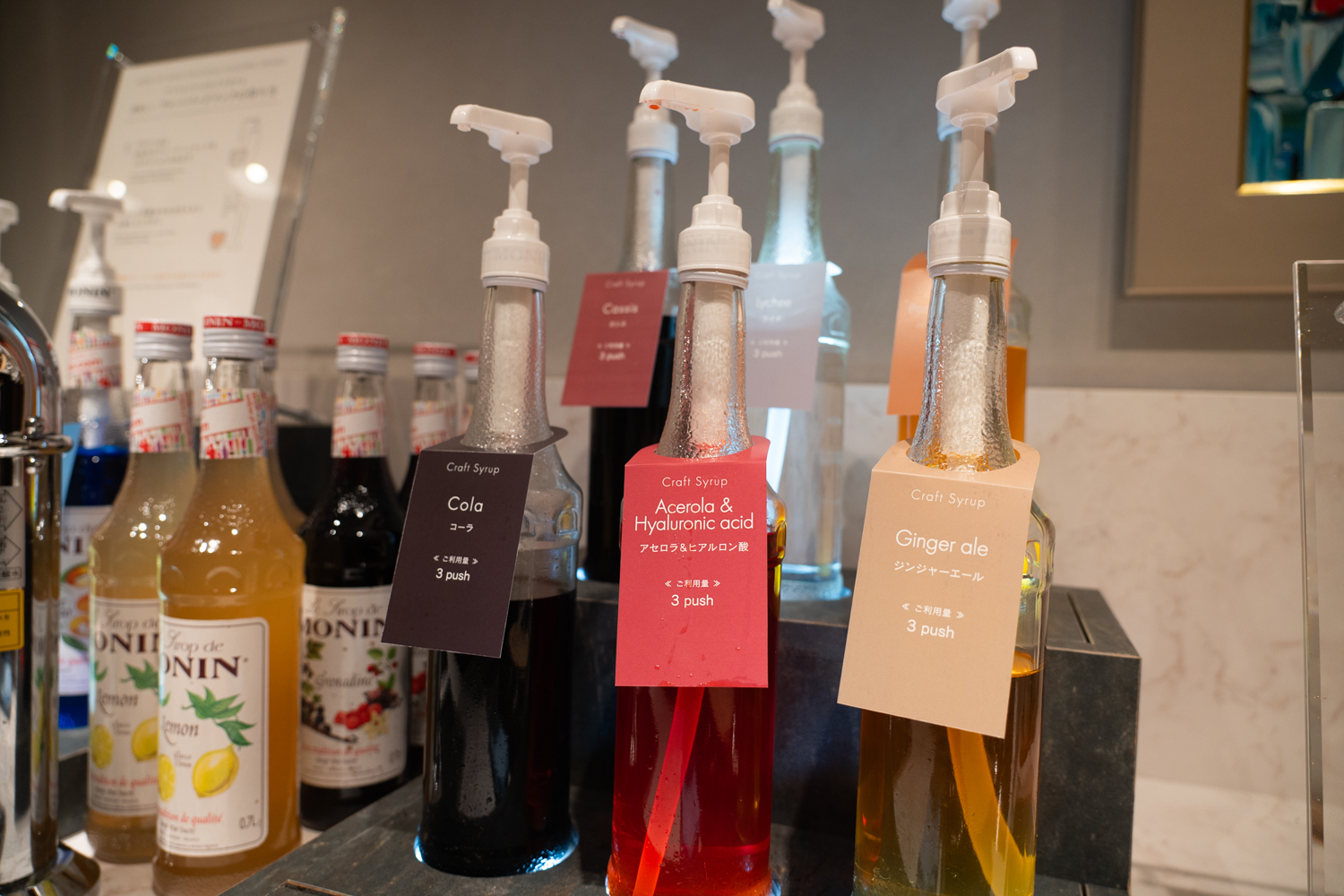 自分の手で完成させる体験型の「フレーバーソーダ」も一押しです。一般的なドリンクバーとは異なり、数種類用意されたモナン社の特製シロップ(原液)をグラスに注ぎ、そこへフレッシュな炭酸水を合わせるという、本格スタイルが採用されています。