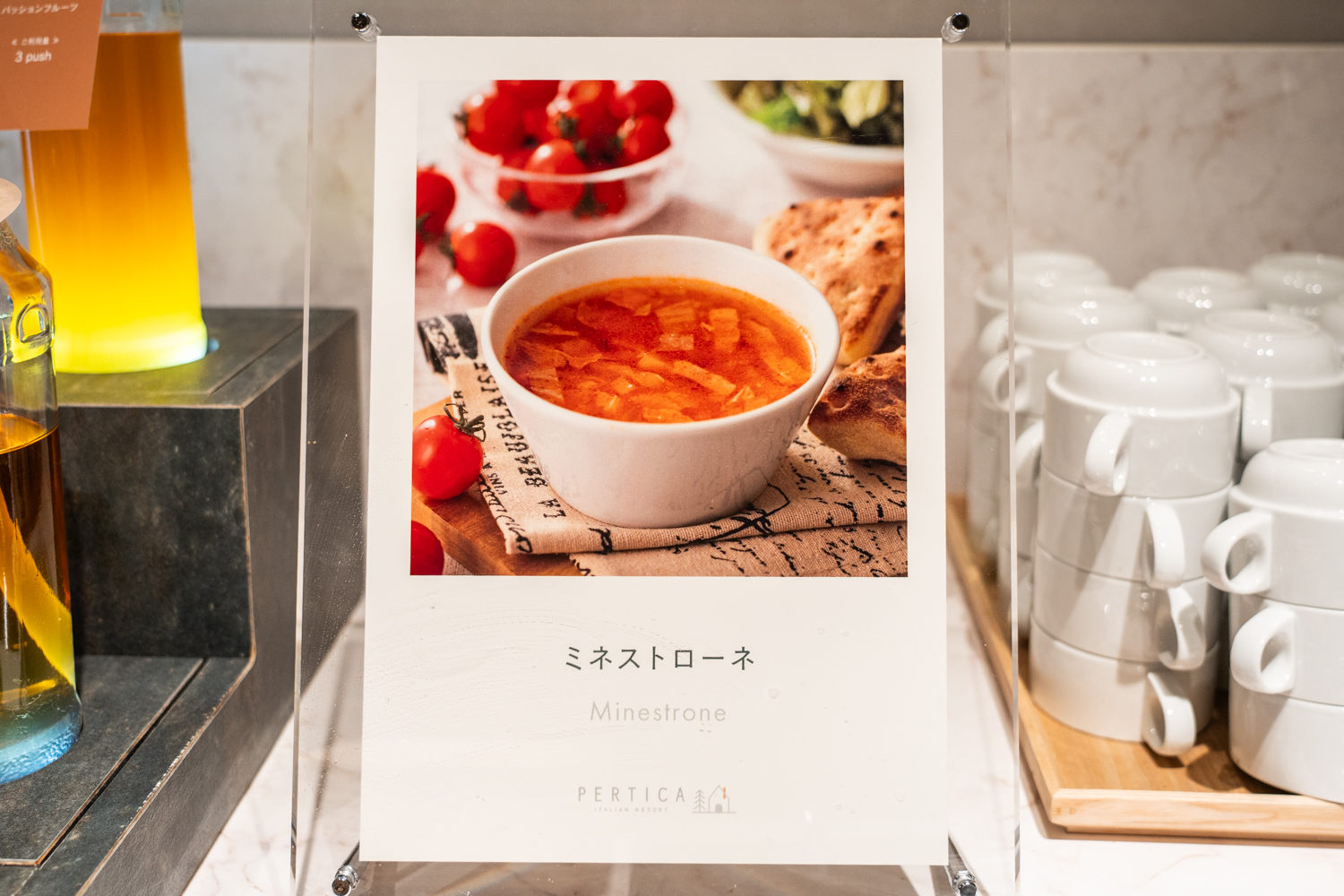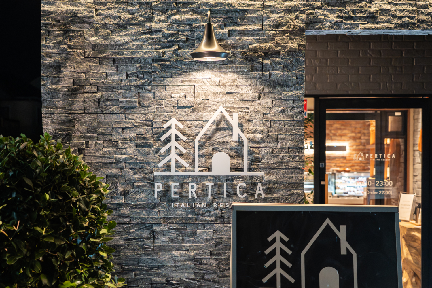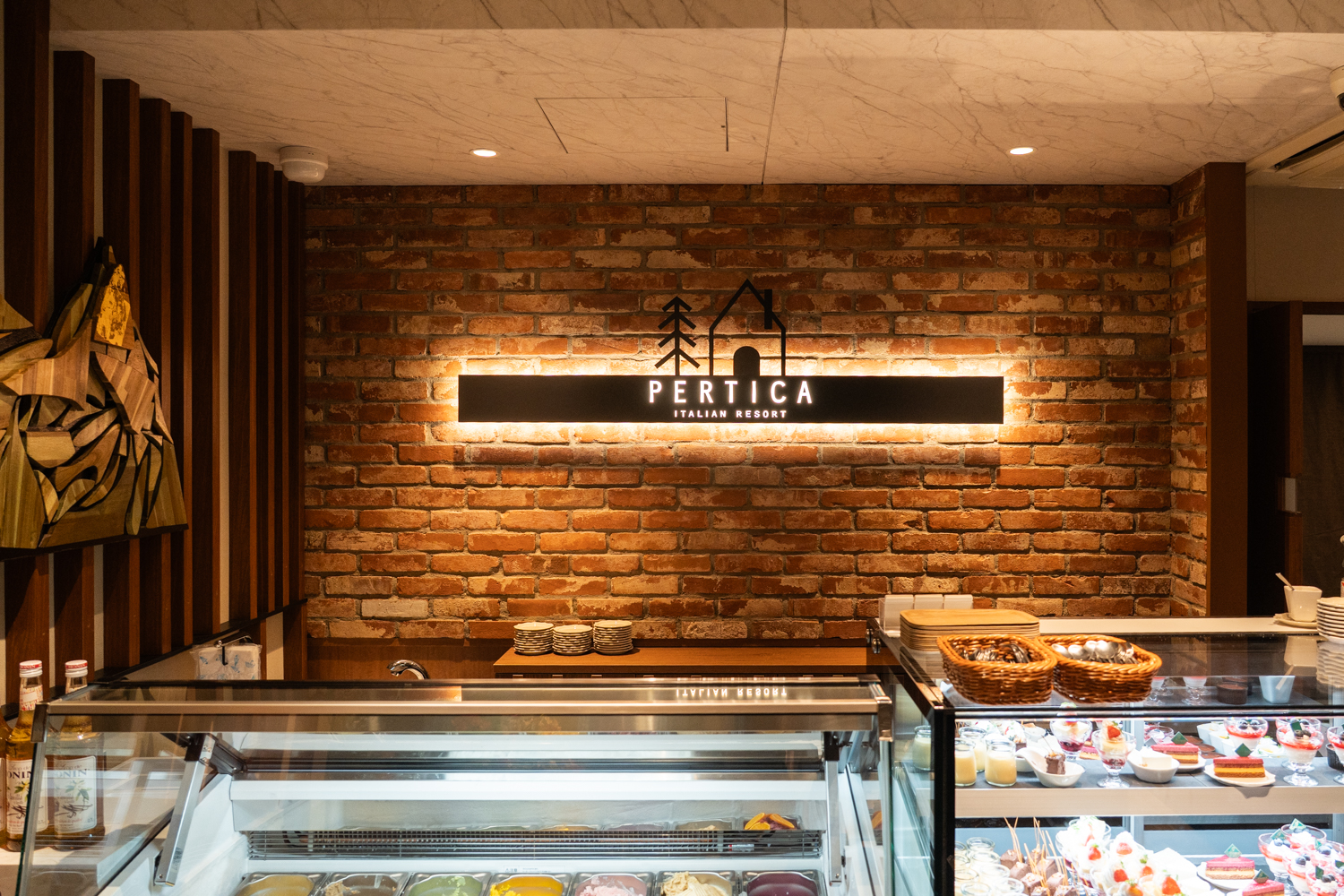 一歩足を踏み入れれば、そこには日常を忘れさせてくれる開放的な空間が広がっていました。レンガ調の壁にあしらわれた「PERTICA」のロゴが、温かみのあるバックライトに照らされ、ゲストを優しく迎え入れてくれます。