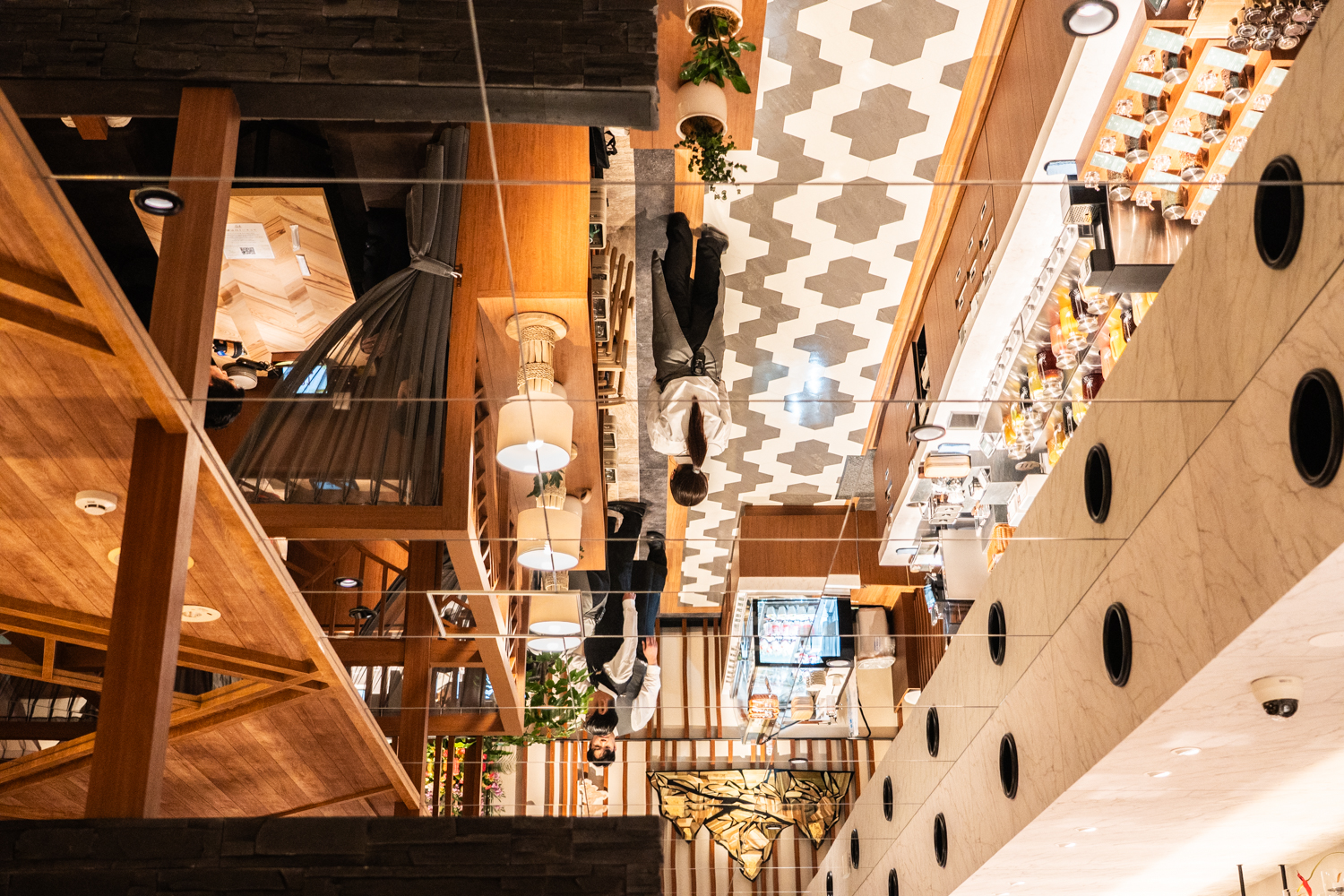 天井には鏡面が多用され、店内の活気が反射して空間をより広く、ドラマチックに見せています。