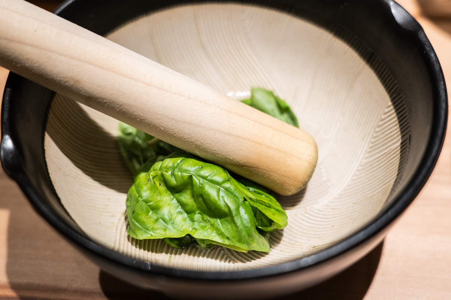 ランチタイムにぜひ選んでいただきたいのが、体験型で心躍る「ジェノベーゼパスタ」です。テーブルに運ばれてくるのは、すり鉢に入った新鮮で大きなバジルの葉。これを自らの手で擦るのです。