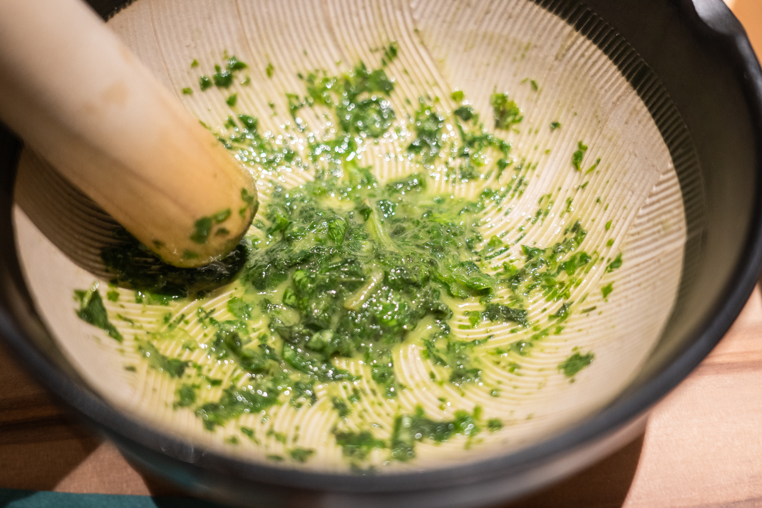 擦り終えると、バジルの瑞々しく華やかな香りが一気に立ち上がり、食欲を優しく、かつ強烈に刺激します。この「出来立ての香り」を一度キッチンへ戻すと、シェフがそのフレッシュな状態のままパスタへと仕上げてくれるのです。