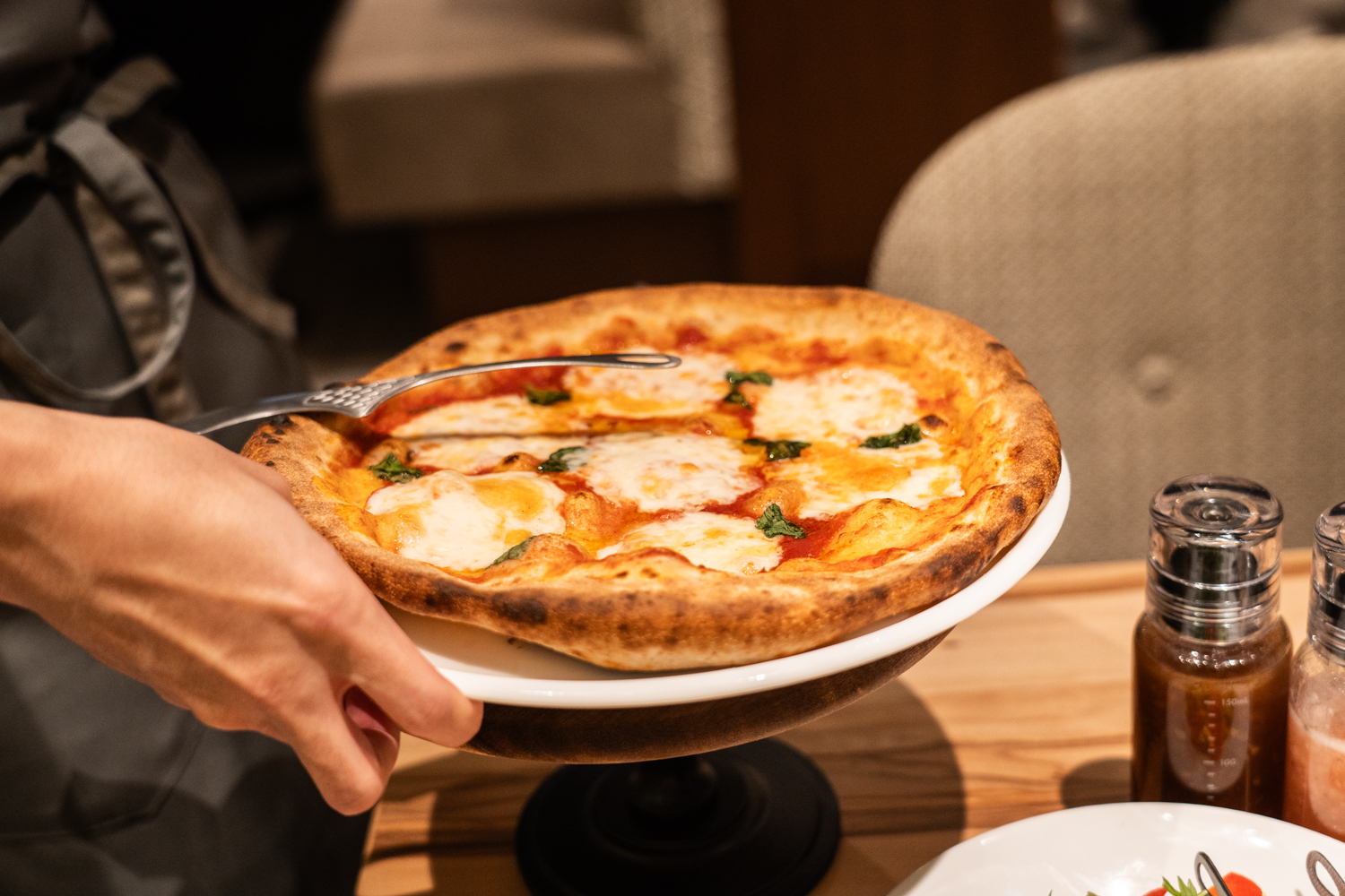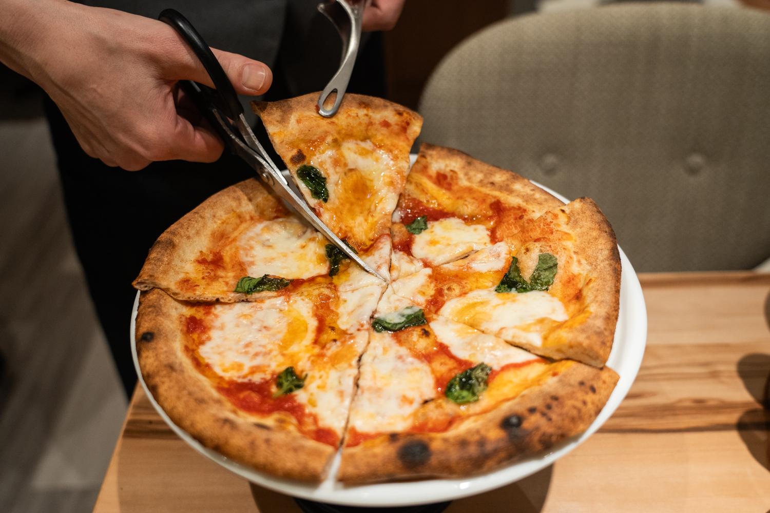 そして、ペルティカ流のユニークな楽しみ方が、「ハサミで切り分ける」スタイル。一般的なピザカッターでは、具材が引きずられたり、チーズが寄ってしまったりすることもありますが、ハサミなら狙ったところをスパッと綺麗にカットできます。断面を美しく保ったまま、一番美味しい状態をスマートにシェアできるのが嬉しいポイントです。