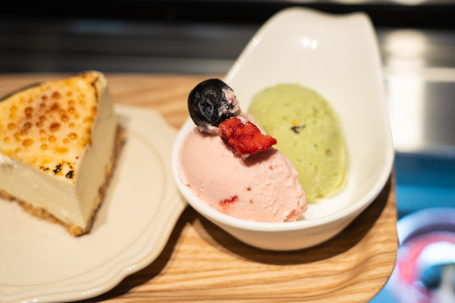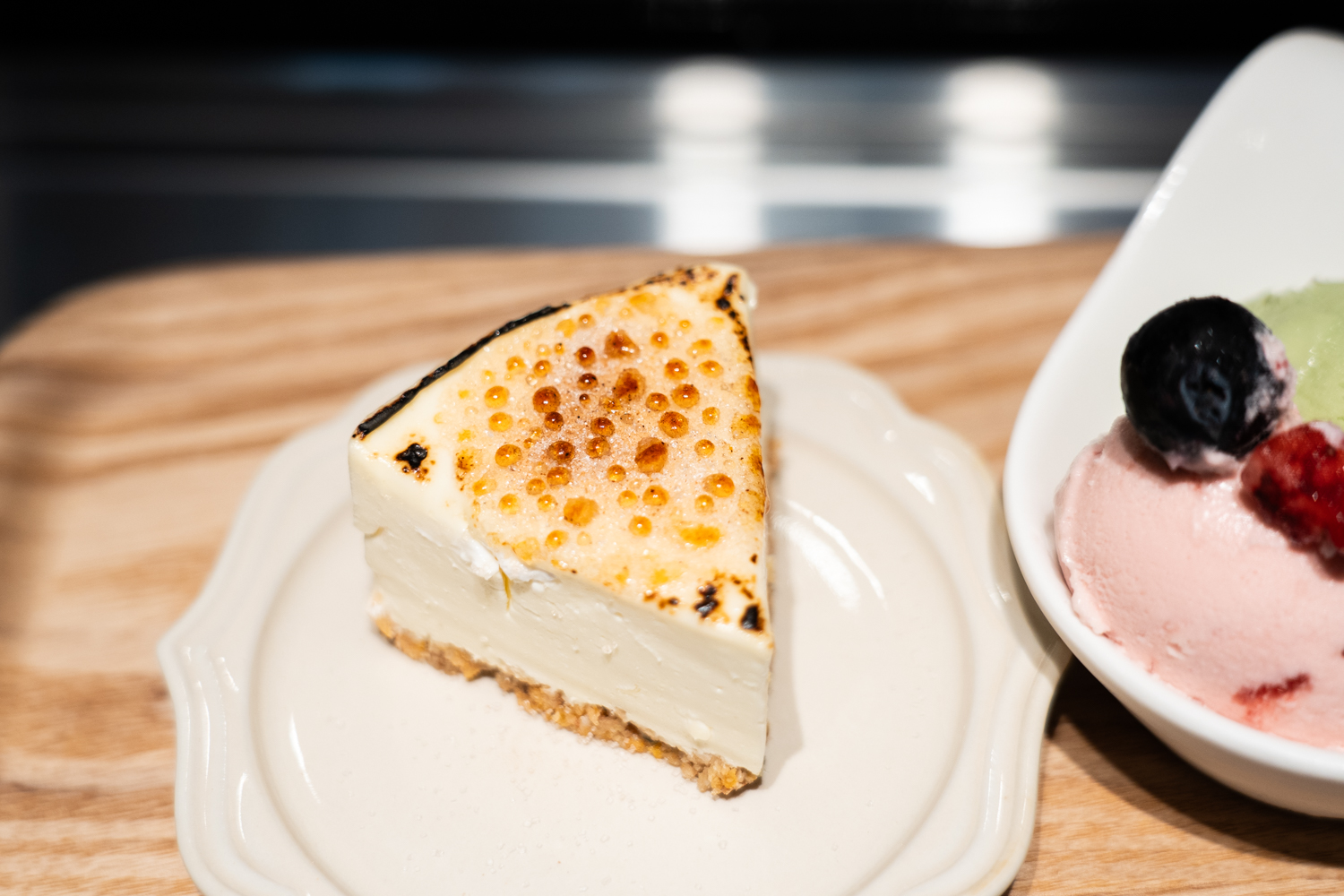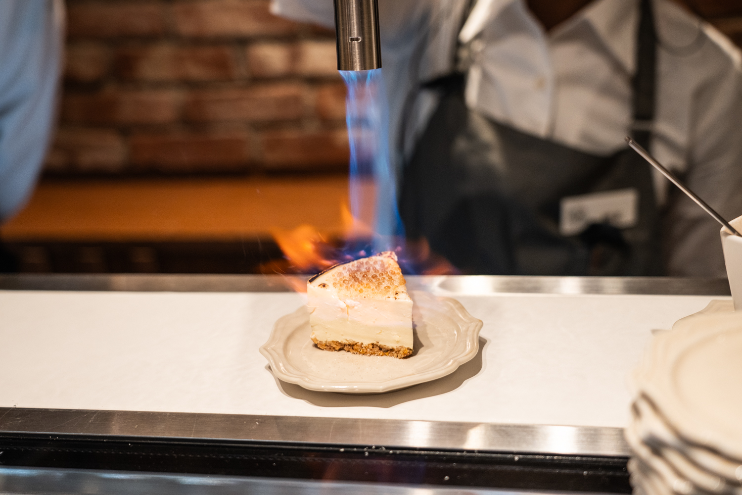 その時々で変わる、季節限定のスイーツは外せません。この日は、スタッフの方が目の前でバーナーを使って仕上げてくれる「ブリュレレアチーズケーキ」が登場しました。青い炎で表面がキャラメリゼされていく様子は、まさにライブ感満載です。