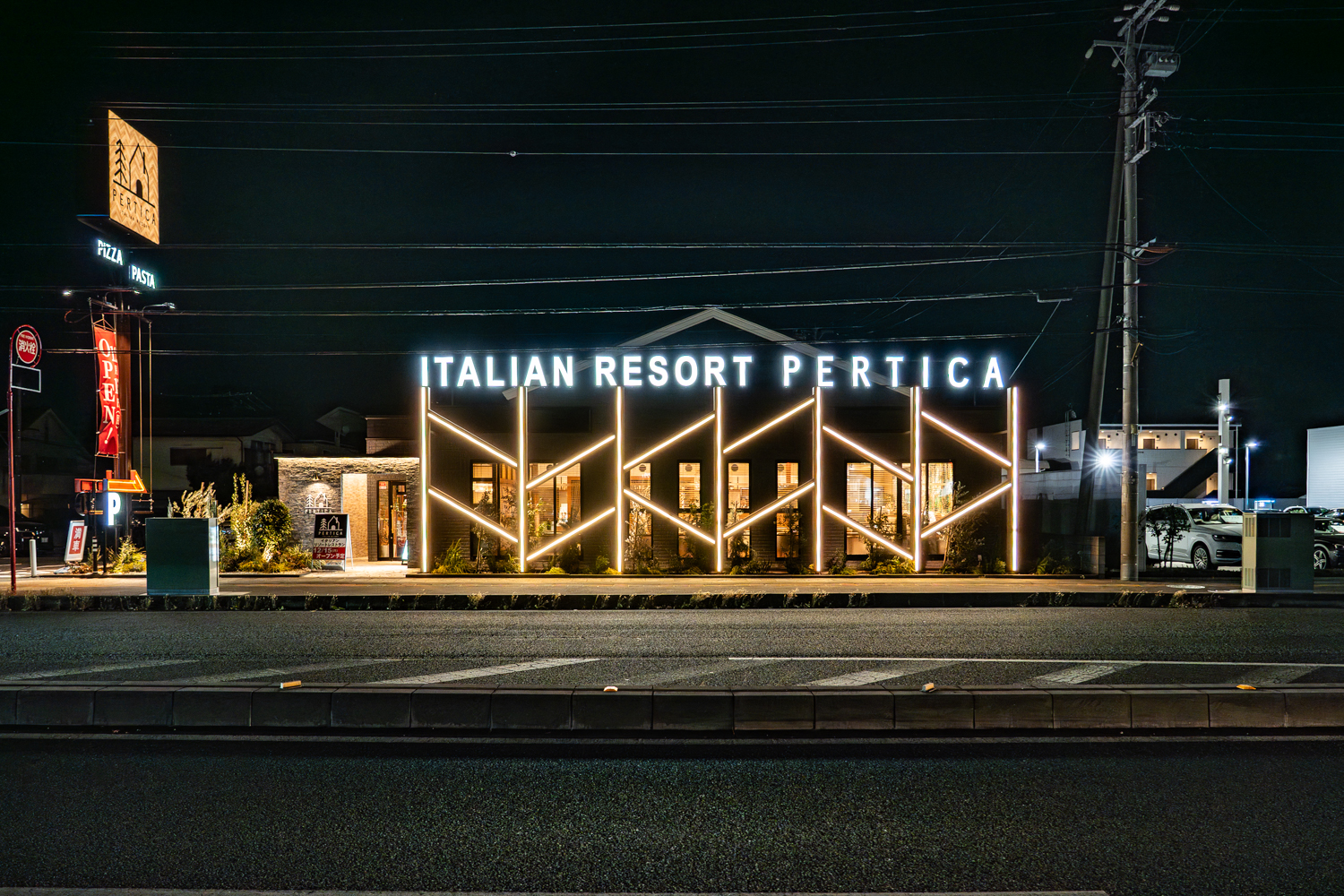 通り沿いに、目を引く洗練された外観が現れます。夜にはスタイリッシュなネオンが輝き、まさに「イタリアンリゾート」の名にふさわしい特別感を演出しています。