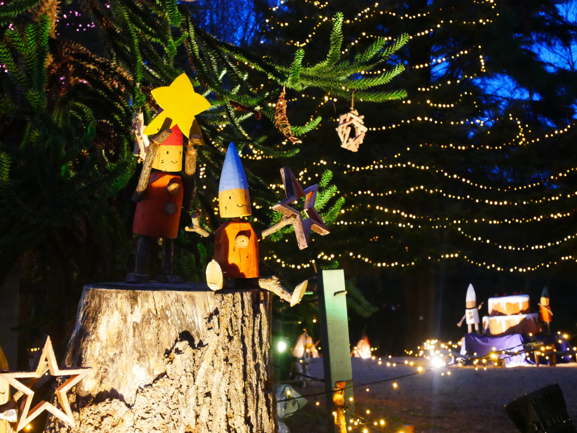 ここでは、モーリーたちがクリスマスマーケットを開催していて、「木の実のお店」や「バームクーヘンのお店」などが立ち並びます。
