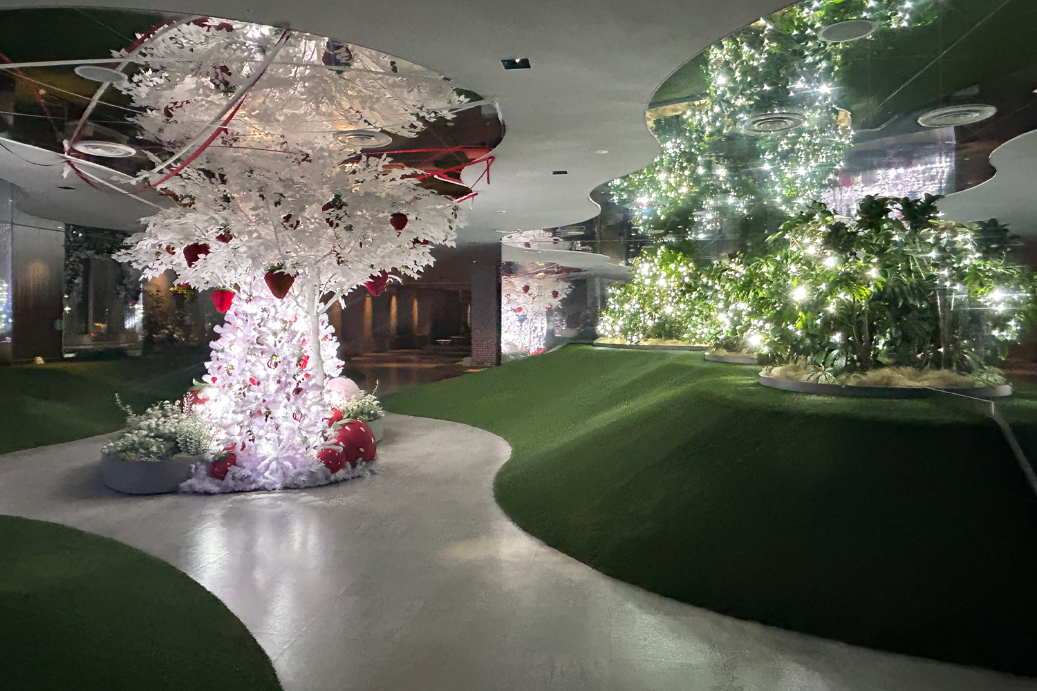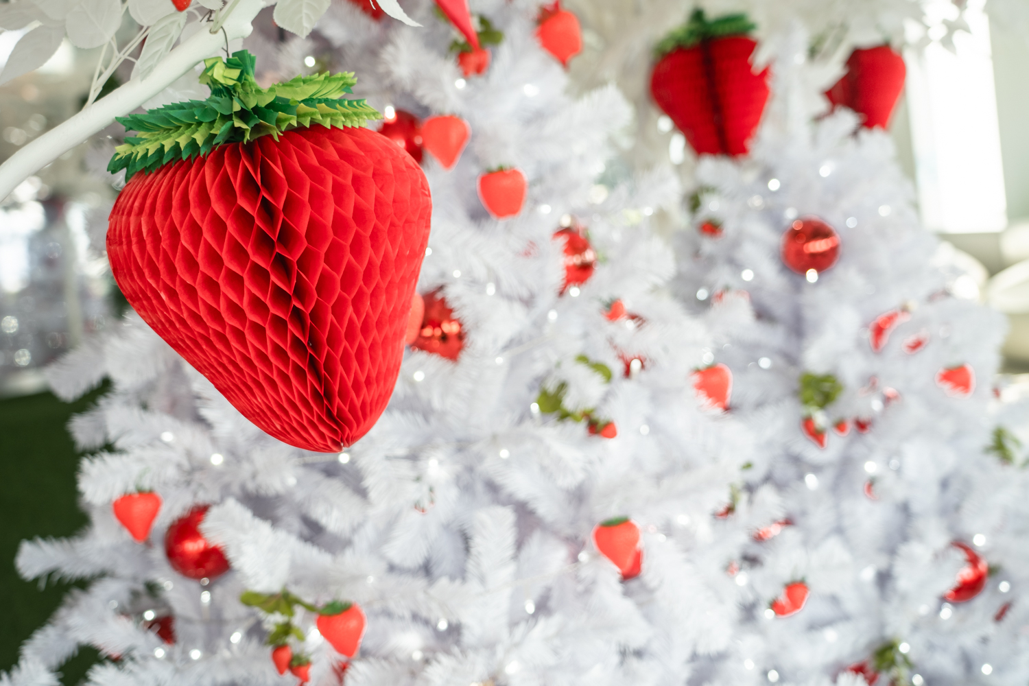 雪をイメージした真っ白なツリーの群れに、真っ赤なイチゴのオーナメントが鈴なりに実っています 。赤と白のコントラストが強烈に可愛らしく、思わず写真を撮る手が止まりません!