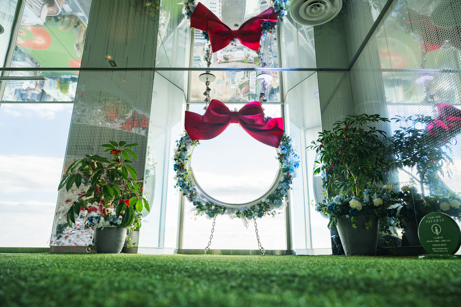 展望台でありながら、足元には草原のような人工芝の丘が広がり、「空の公園」の名にふさわしい、都会の上空とは思えない不思議な癒し空間が演出されています。