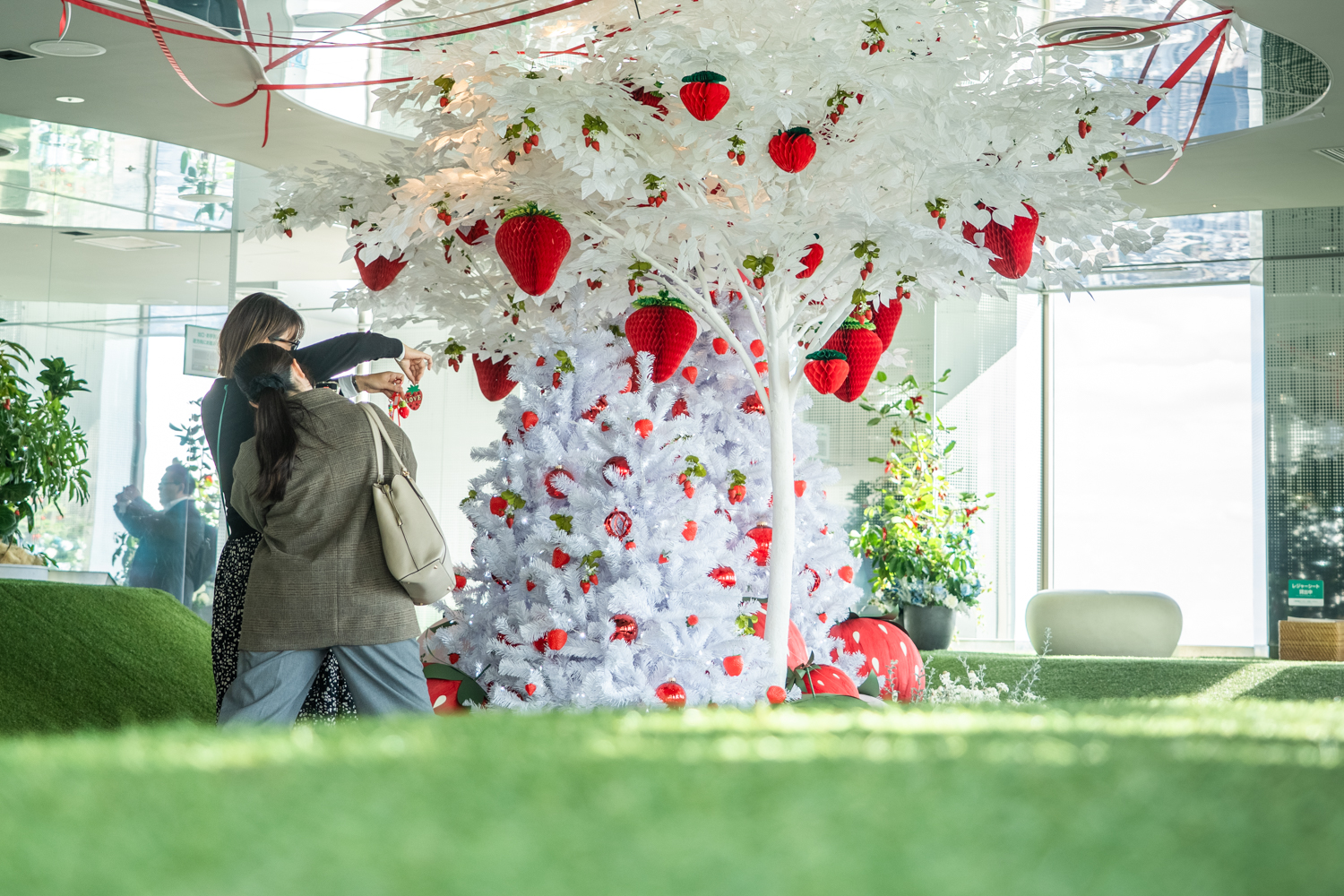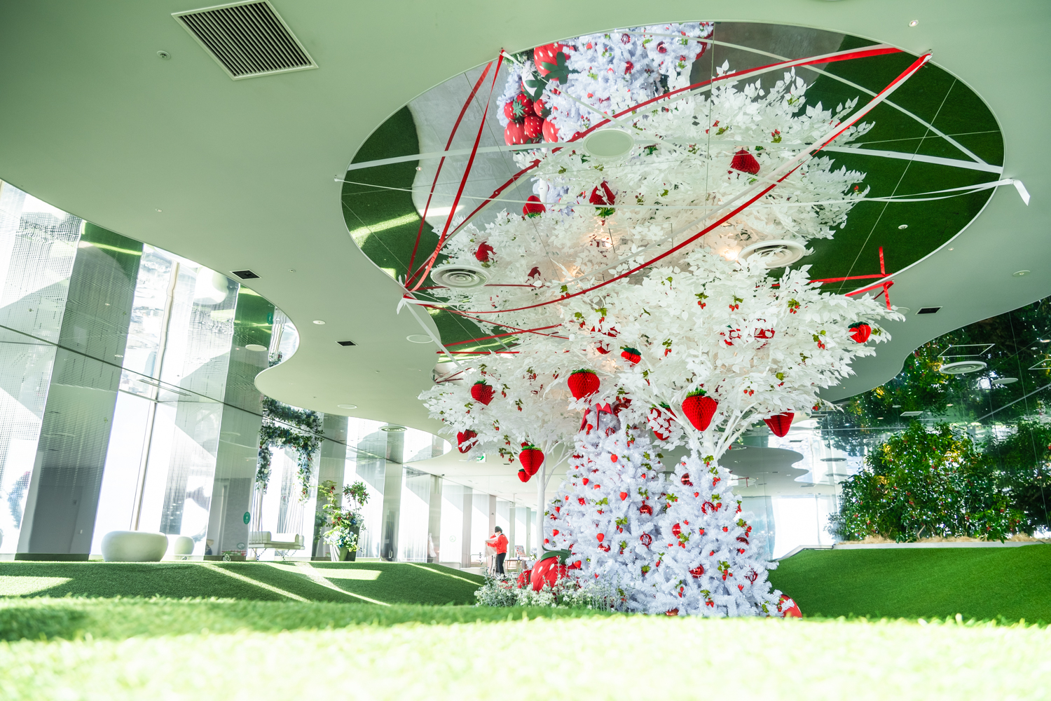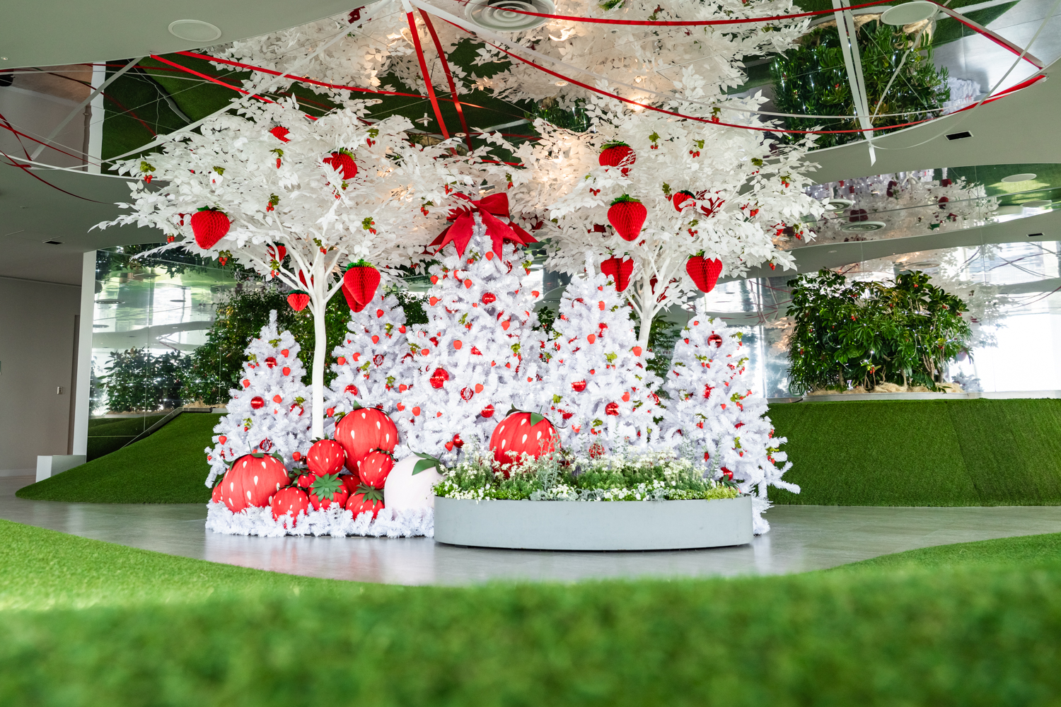 今回のイベントのテーマは、ずばり「いちごが実る冬の空の公園」。海抜251mの都会の上空に、白い雪と澄んだスカイブルー、そして真っ赤ないちごのコントラストが映える、幻想的な空間が広がっています。