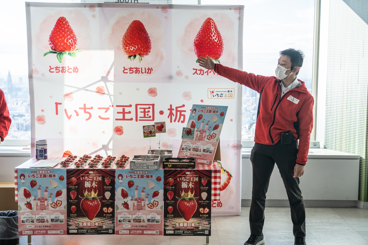 今回のイベントは、いちご王国・栃木県との連携が非常に密接です。この日は、甘くて高品質な栃木県産ブランドいちご「とちあいか」「とちおとめ」「スカイベリー」の3種を試食させていただきました。