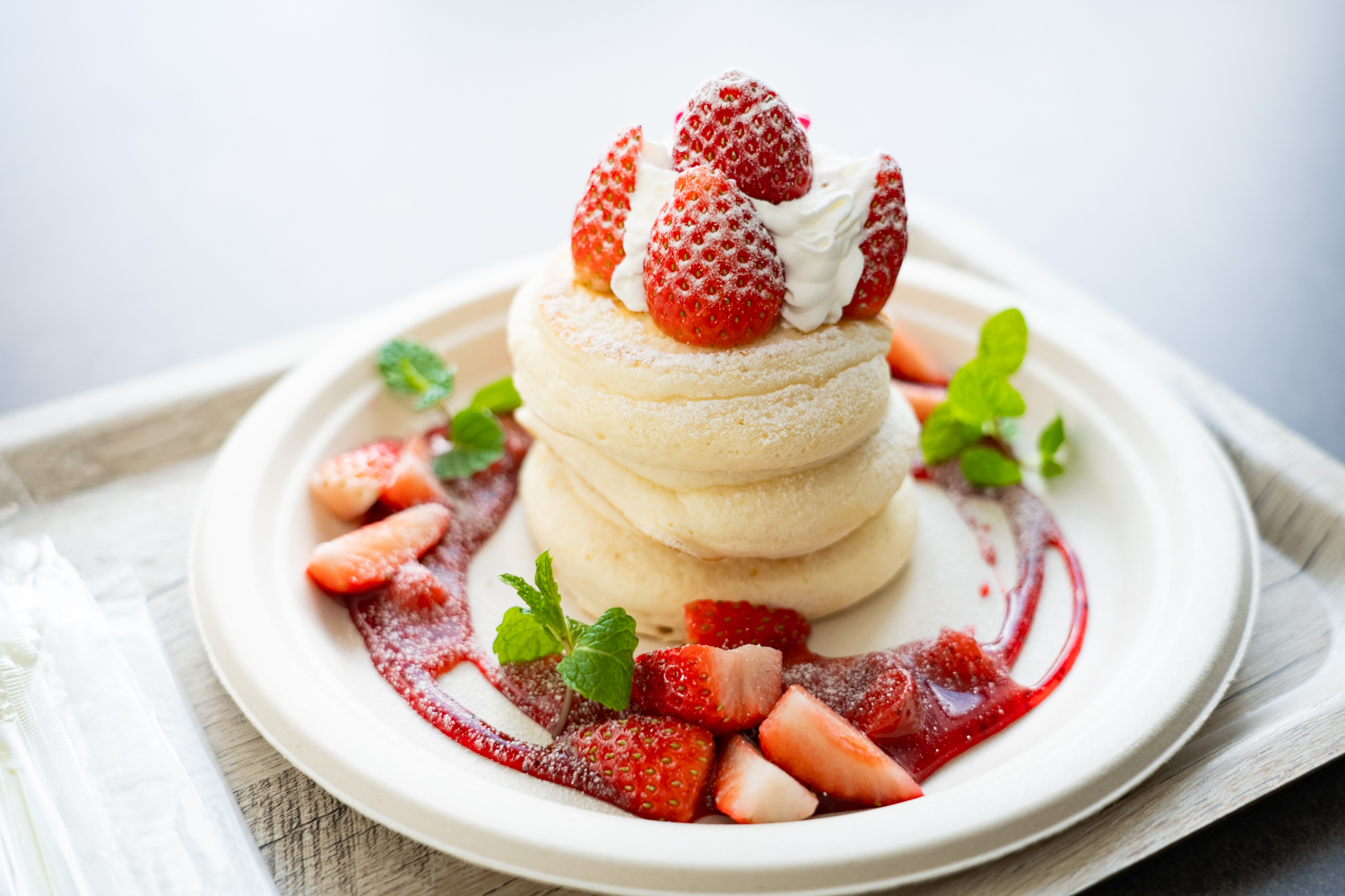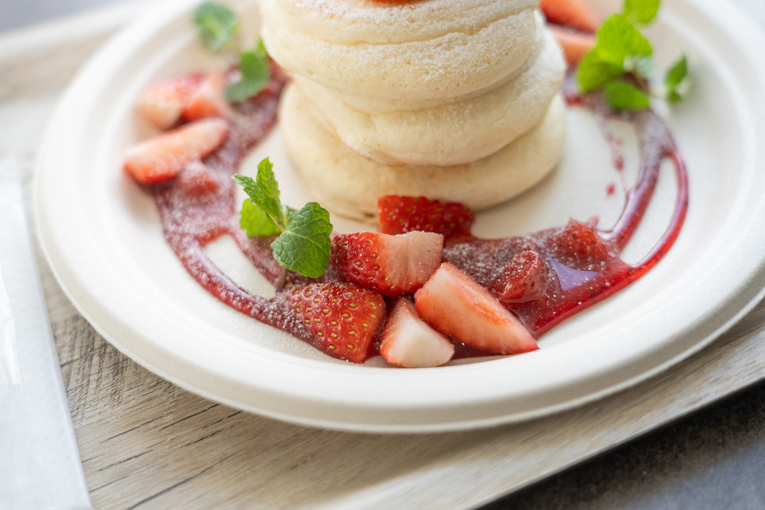 今回、特別に試食させていただいたのが、この「お空のふわふわいちごパンケーキ」です 。トップには主役のいちごが堂々と鎮座 。白いクリーム、赤い果実、そして緑のミントが織りなす三色のコントラストが映えます。