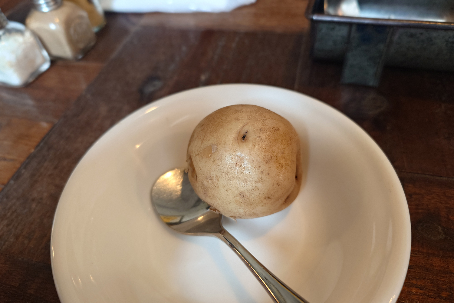 ちなみに最初に出てきたのは、かわいらしい丸いポテト。ほくっと優しい味わいで、胃袋の準備運動にはちょうどいい大きさです。