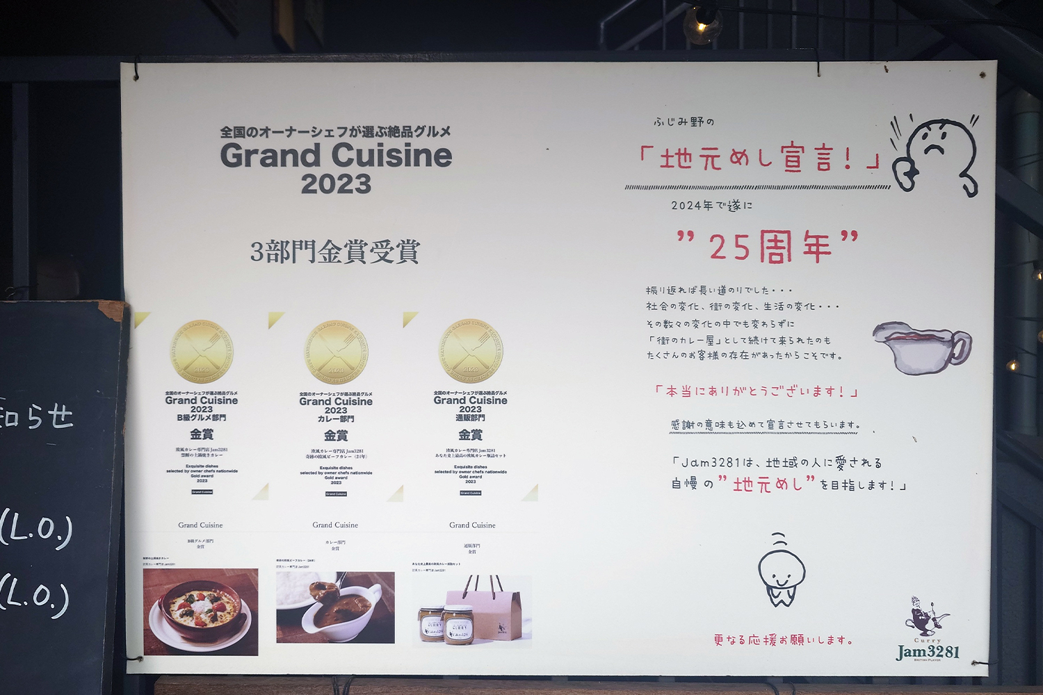 「jam3281」は、ふじみ野で1999年にオープンしたカレー専門店。入口には「Grand Cuisine 2023 3部門金賞受賞」の掲示があり、全国のオーナーシェフが選ぶコンテストで高く評価された実力店です。