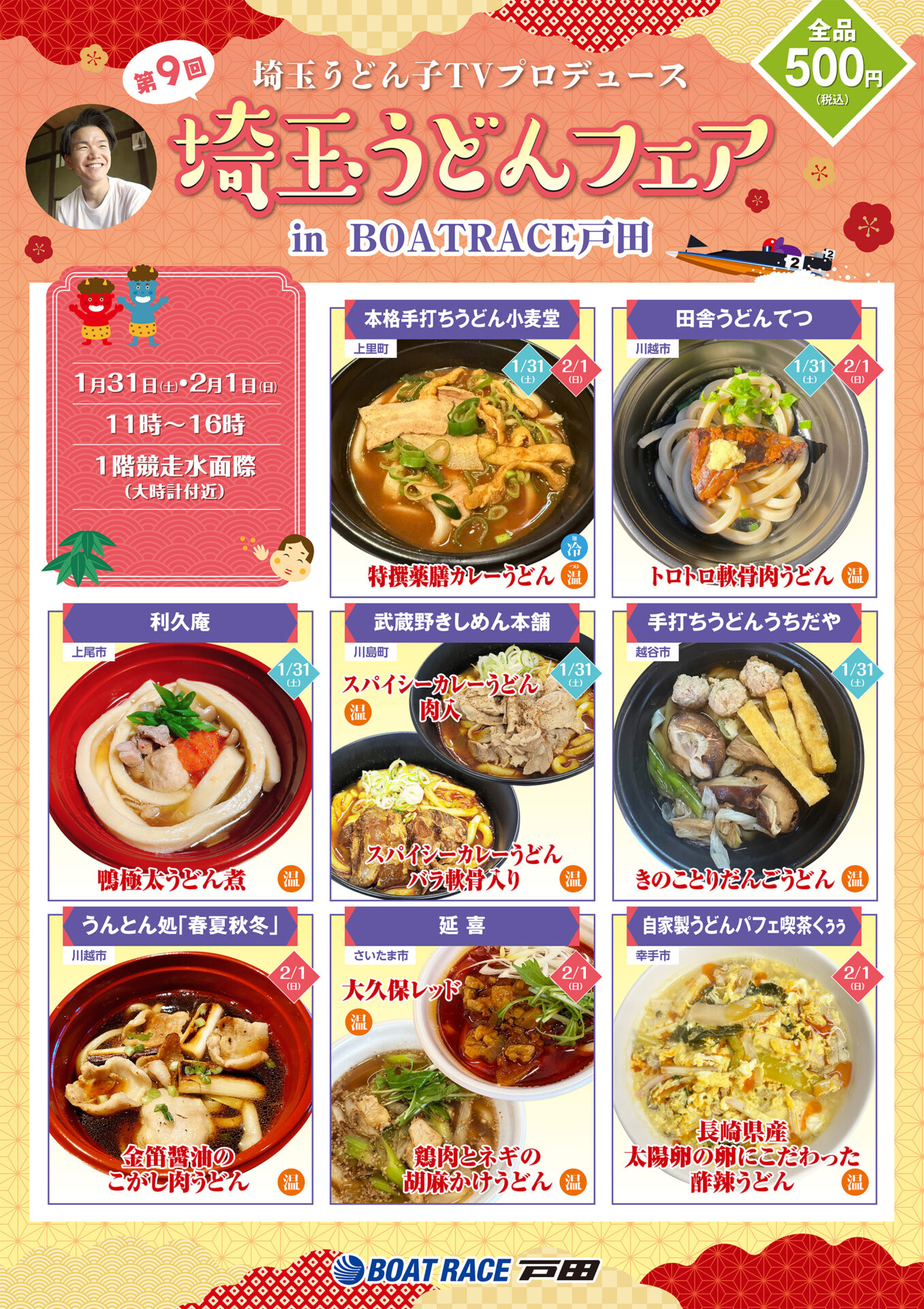 同じく埼玉県を代表するボートレース場である『BOATRACE戸田』にて、1月31日(土曜日)と2月1日(日曜日)の2日間『第9回埼玉うどんフェア』が開催されます。