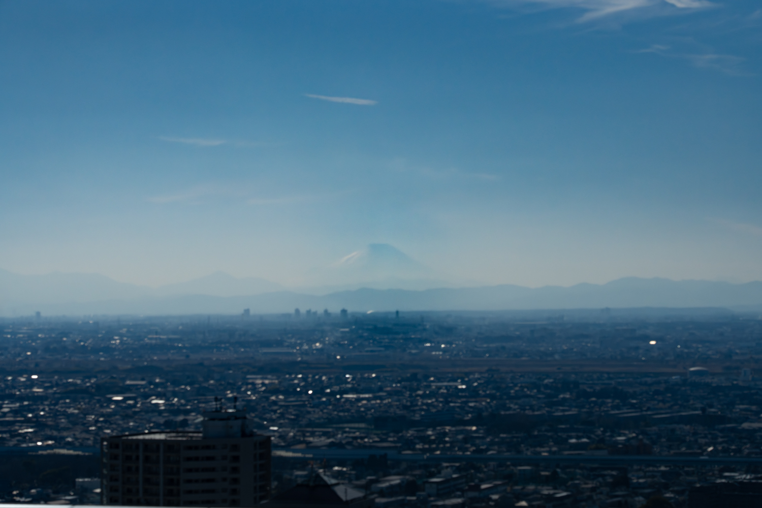 この日は雲がかかっていましたが、それでも山頂だけが顔をのぞかせていました。都市の向こうに富士山が見えるという光景は、やはり特別です。