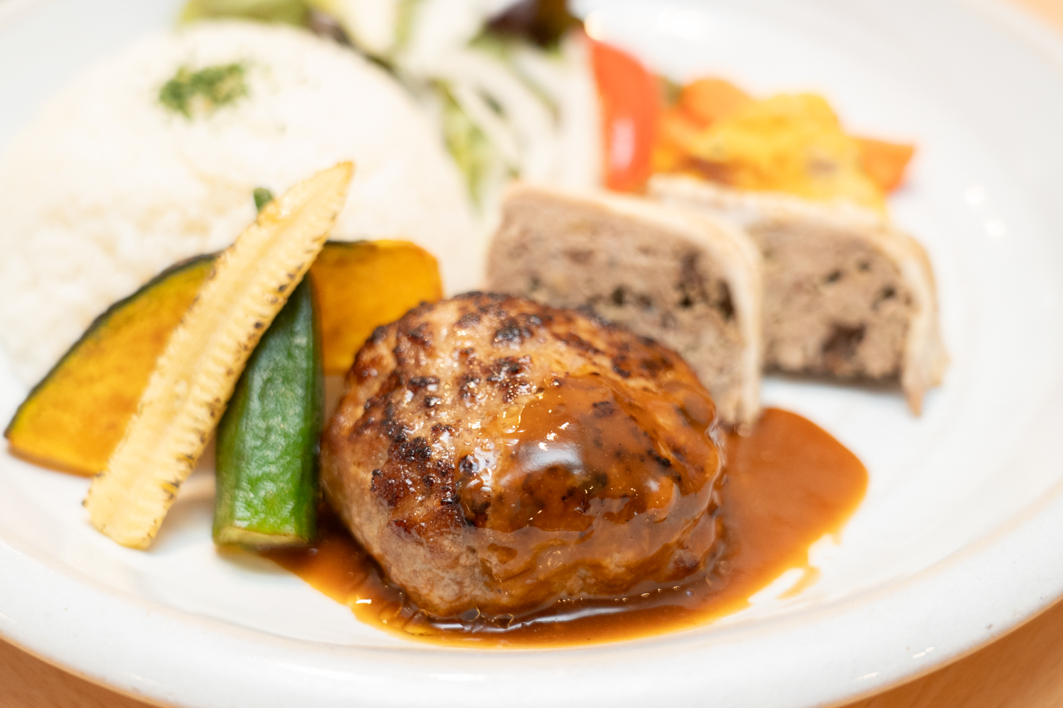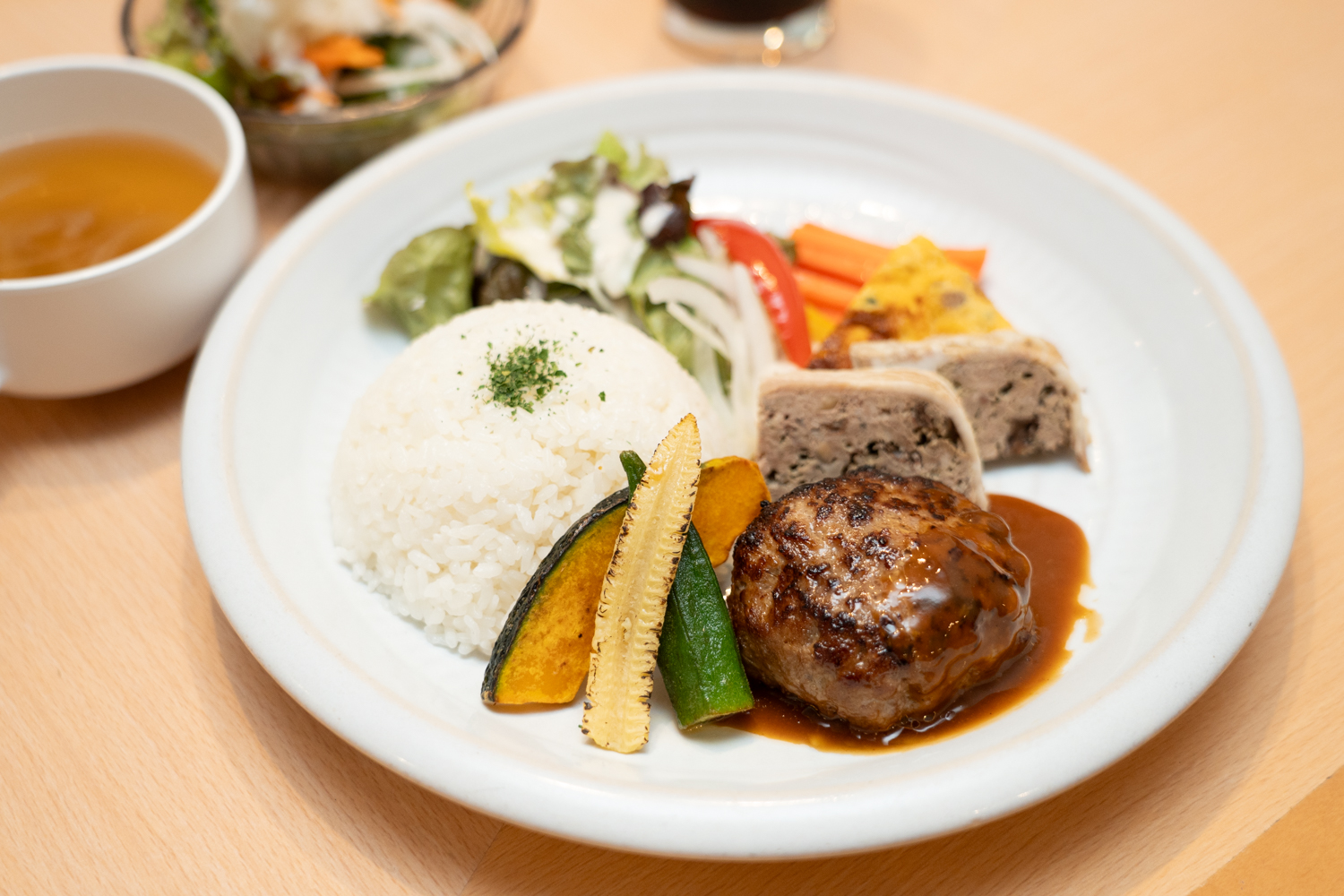 運ばれてきたプレートには、ふっくらと盛られたごはん、彩りのよい野菜、そして艶のあるデミグラスソースをまとったハンバーグ。