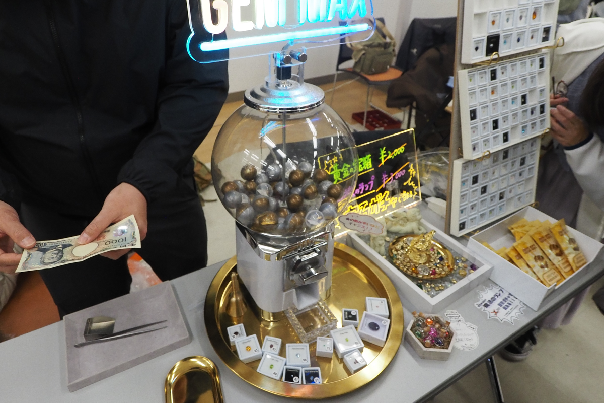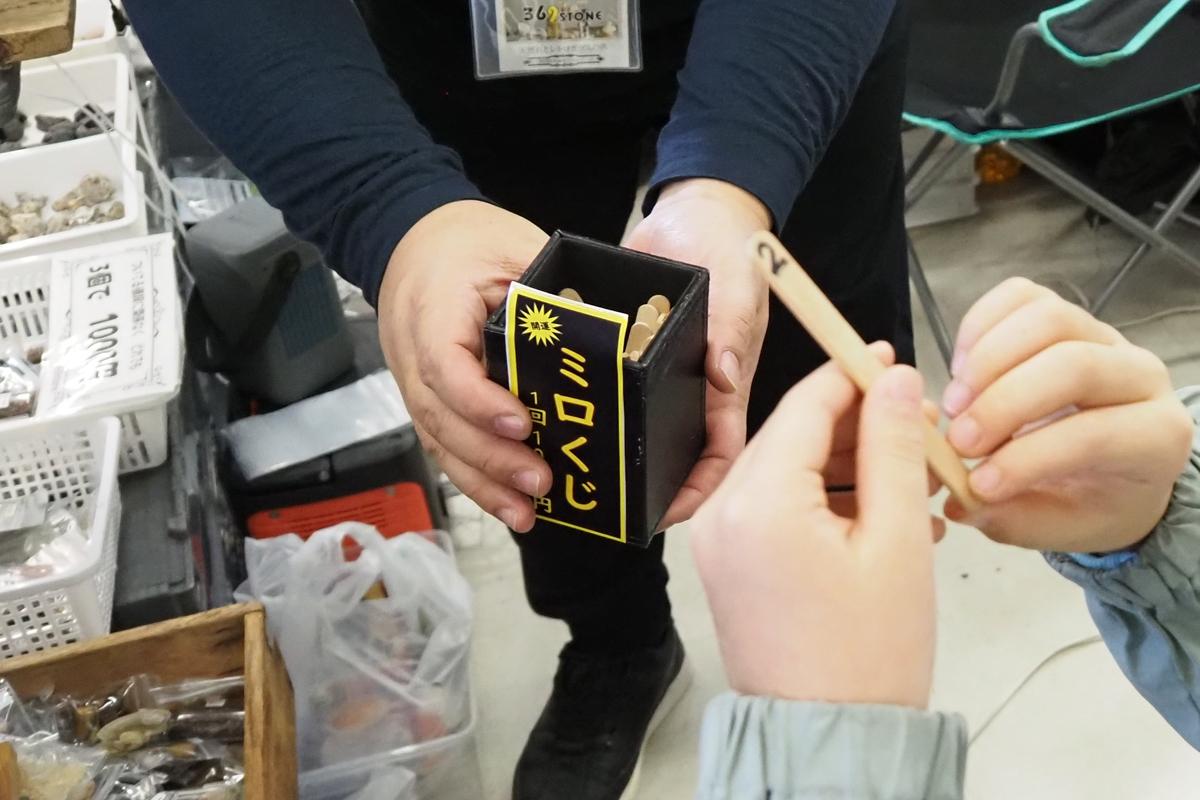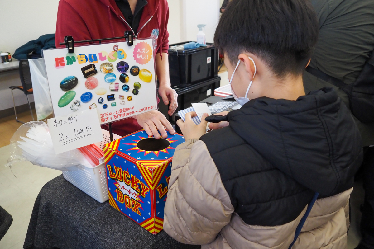 「子どもから大人まで盛り上がっていたのが「くじ」系。こちらは宝石のルースがゲットできる「たからいしくじ」。なんと2個1000円!子どもたちが1000円をにぎりしめて並んでいました。