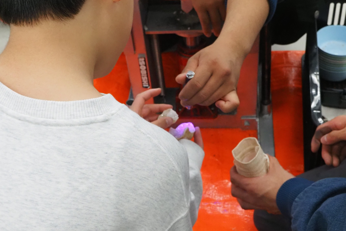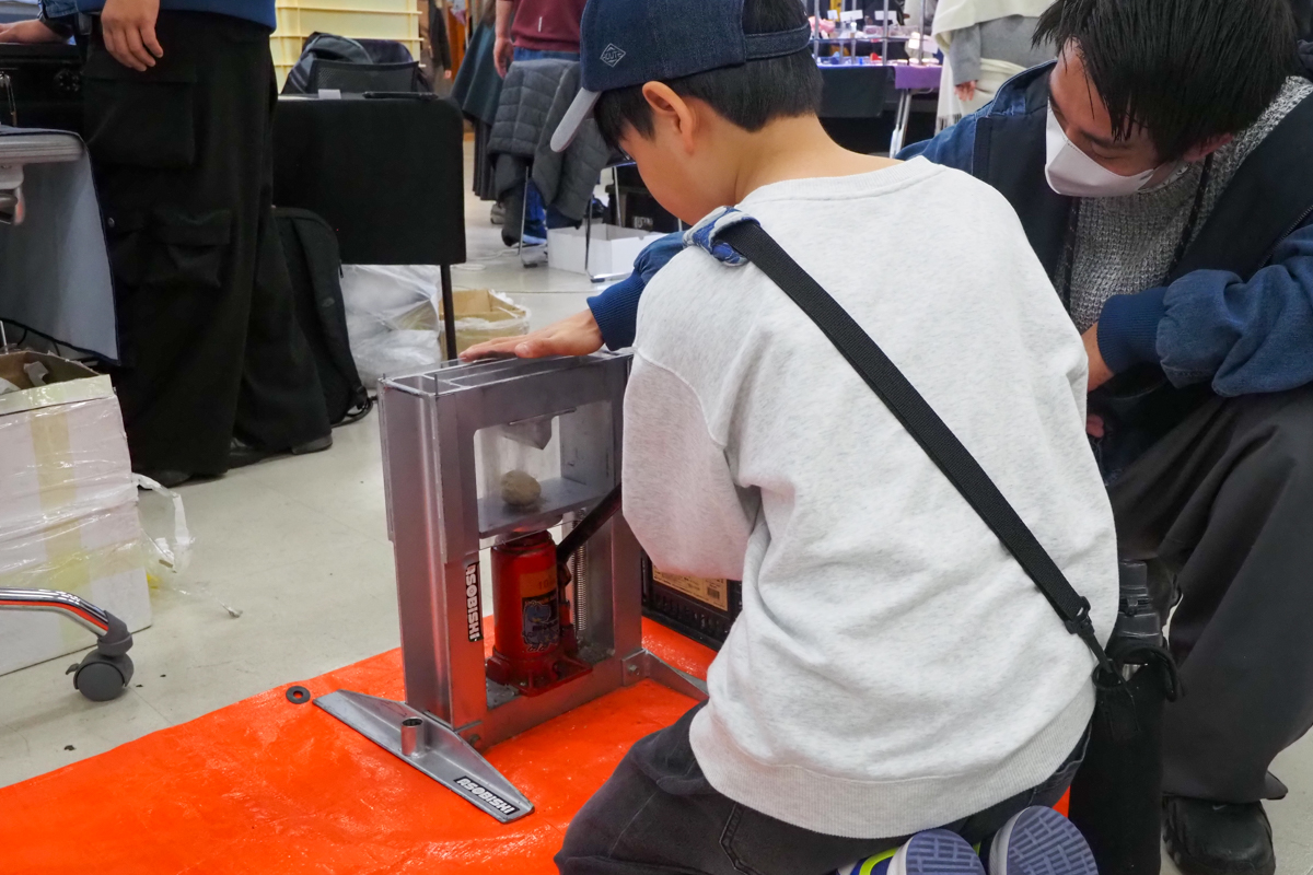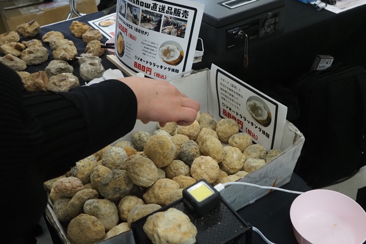 石好きには定番の「ジオードクラッキング」コーナー。ジオード(晶洞)を割って、中にできたキラキラした鉱物結晶を観察する体験です。