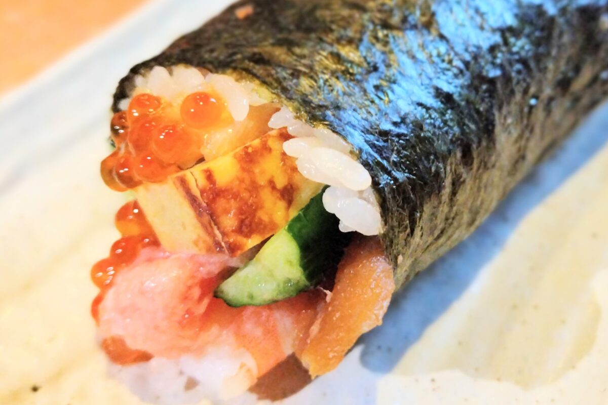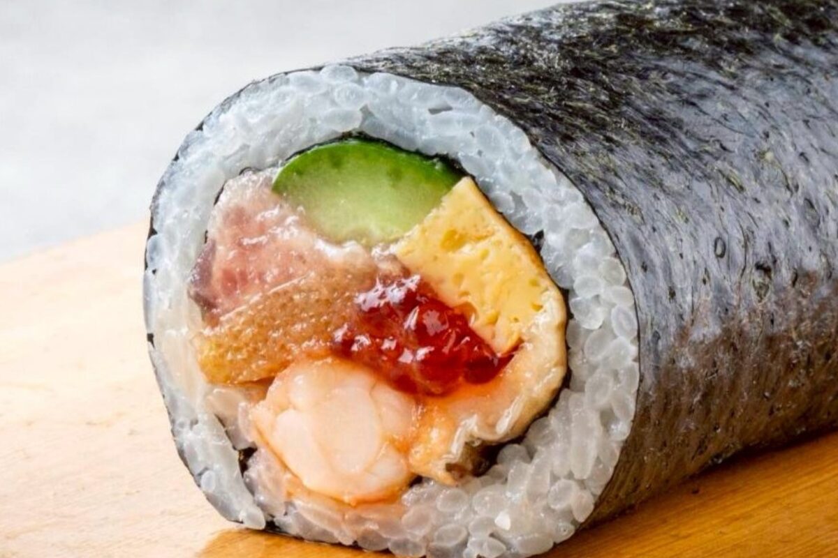 海老、穴子など12種類の具材を巻いた、一口ごとに違う味が楽しめる極太巻。