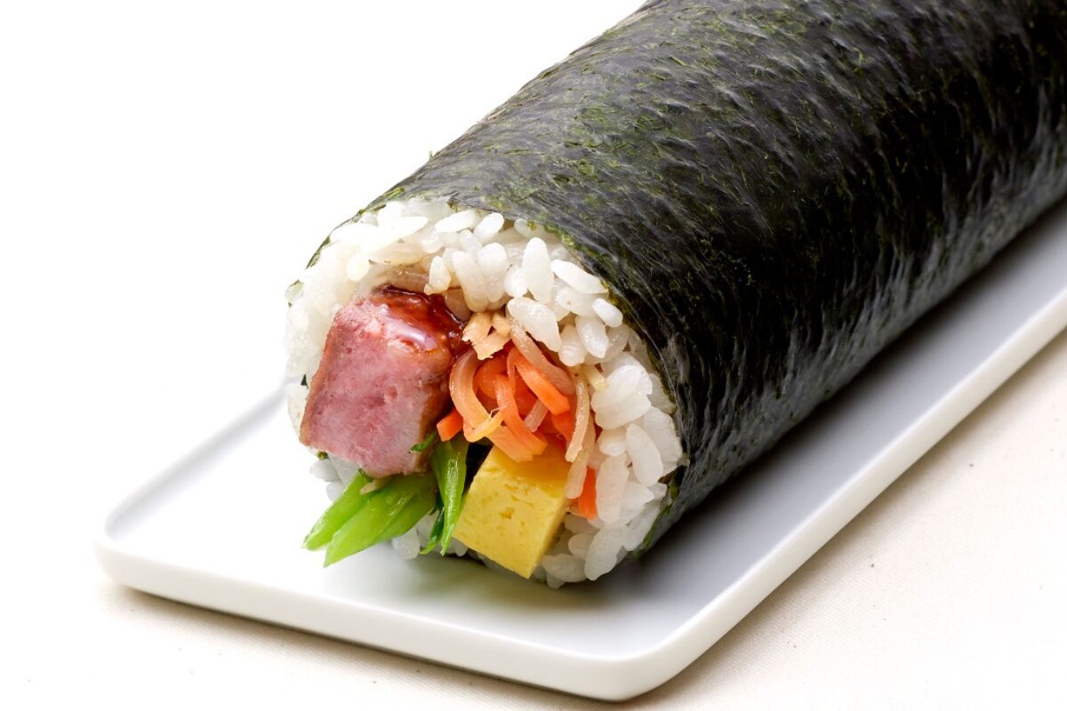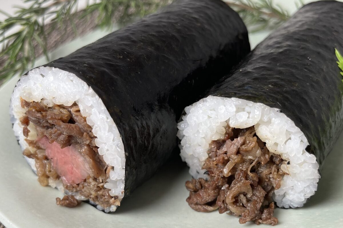 黒毛和牛の希少部位「カイノミ」のステーキを九条葱のソテー、金平ごぼうなどと巻いた恵方巻。