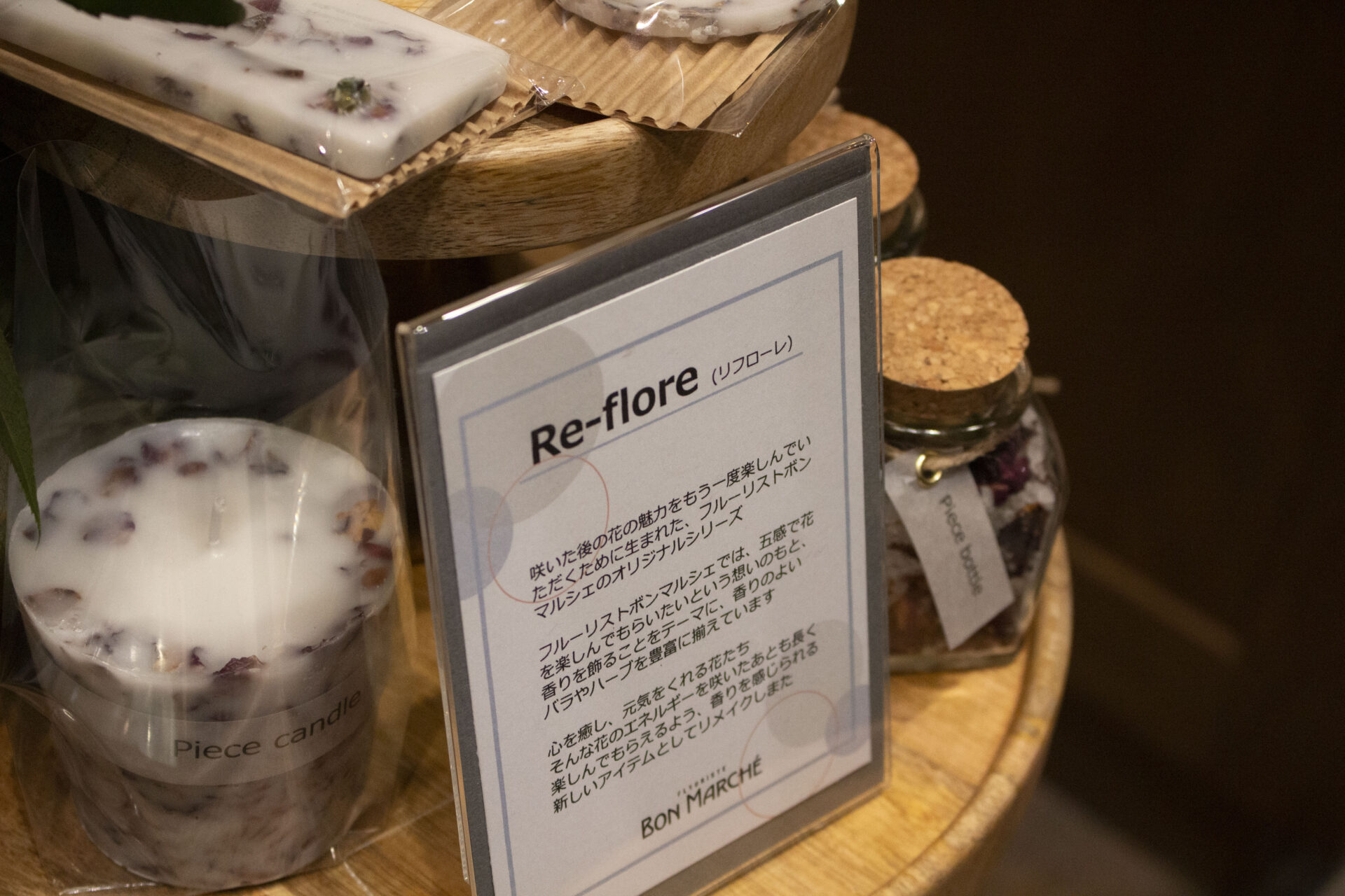 咲いた花をふんだんに使用した、香りを楽しむオリジナル商品「リフローレ」です。微かに柔らかいバラの香りがしました。リビングのキャンドルライトとして活躍できる予感。