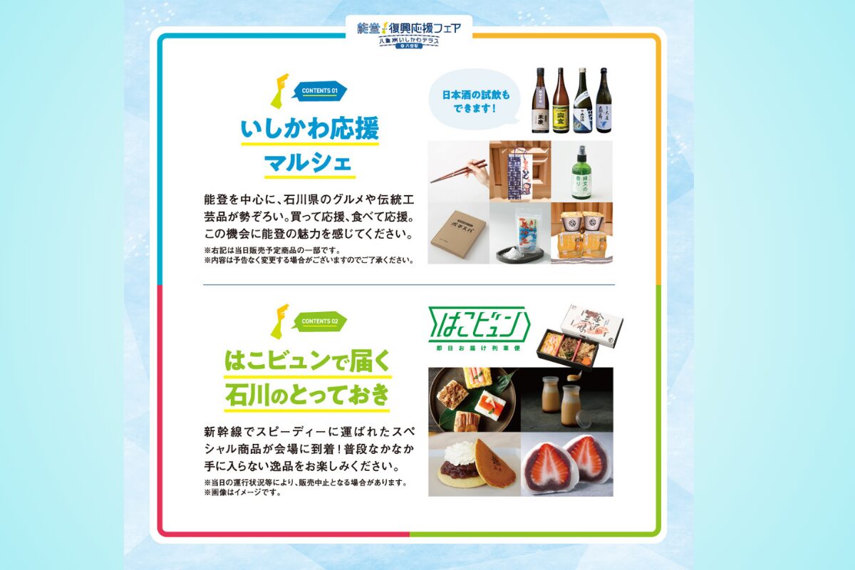 また、物販だけでなく、能登の復旧・復興状況の展示や、これからの季節に観光として楽しめる「今行ける能登」の情報もお届けするとのこと。