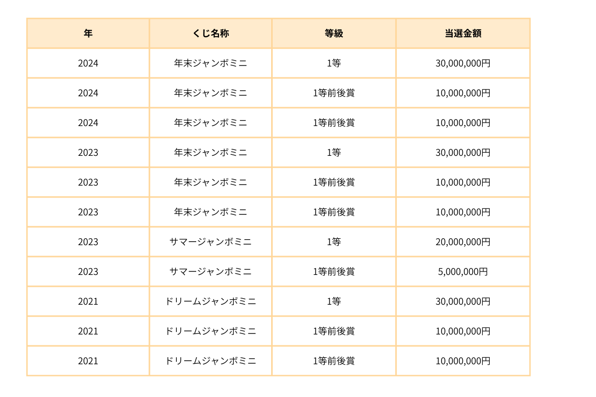 特に大宮DOMチャンスセンターはミニジャンボの相性が良いようで、コンスタントに当選者を出していることが分かります。